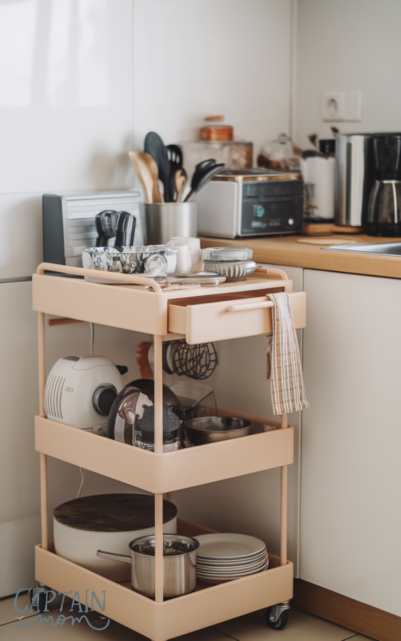 A rolling kitchen cart is a top kitchen organization with limited cabinet space solution. It adds storage and counter space where cabinets are lacking. Many carts include shelves, drawers, or hooks for utensils and small appliances. They are mobile, versatile, and perfect for temporary storage in tight kitchens. With a multi-functional cart, you can keep essentials organized, accessible, and off crowded countertops.