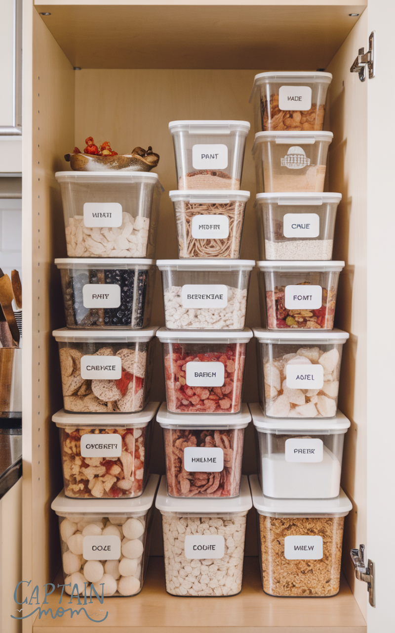 Stackable containers optimize vertical space, making them a key kitchen organization with limited cabinet space solution. Store grains, pasta, or snacks in clear containers that can be stacked neatly. Labels make it easy to find ingredients quickly. This method keeps cabinets tidy, maximizes storage, and ensures your pantry looks visually organized while saving space for other essentials.