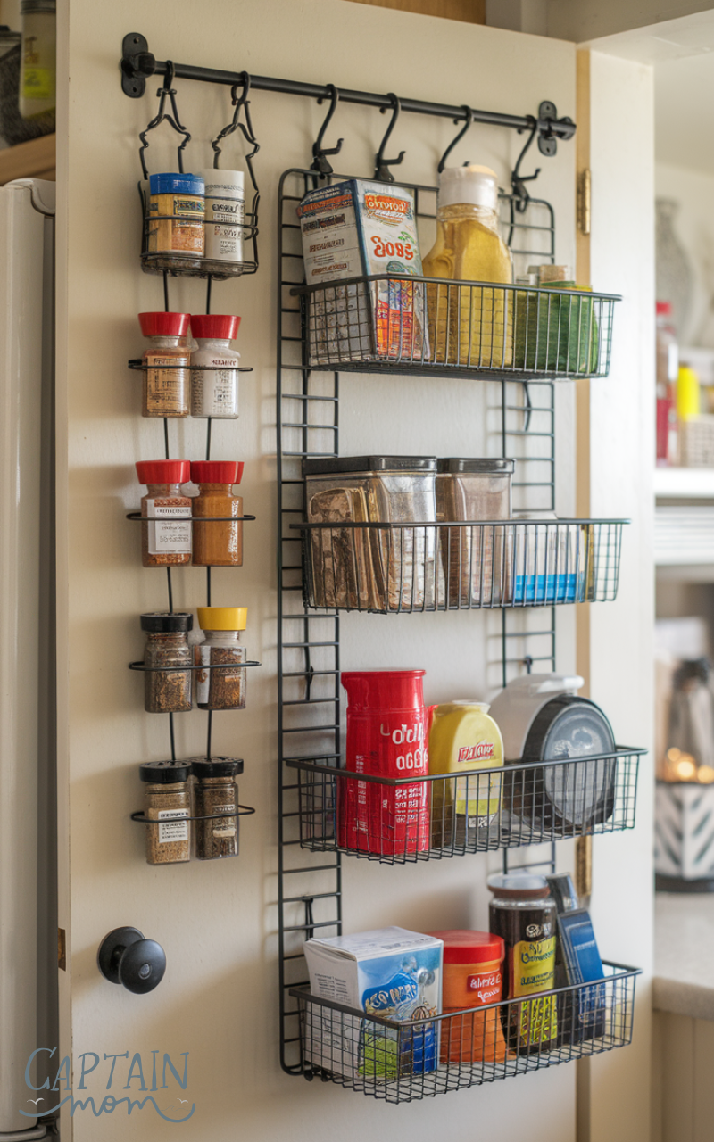 Over-the-door racks and organizers are clever kitchen organization with limited cabinet space tools. You can hang spice racks, small baskets, or cleaning supplies on cabinet doors. This approach keeps frequently used items accessible while utilizing often-overlooked space. It’s a low-cost way to add storage without expanding your kitchen footprint, perfect for small apartments or compact kitchens.