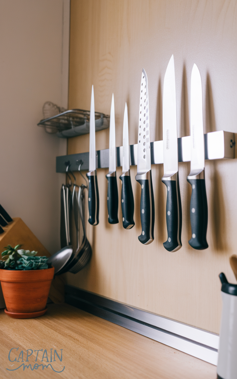 Magnetic knife strips are a smart kitchen organization with limited cabinet space solution. Mounting knives on the wall frees up drawer space and keeps them within easy reach. It’s safe, visually appealing, and prevents clutter. This simple hack works especially well in compact kitchens, providing a stylish and functional storage option while keeping knives organized and easy to grab during meal prep.