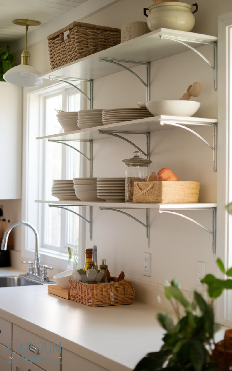 Wall-mounted shelves are an excellent kitchen organization with limited cabinet space idea. Use them to store dishes, jars, or decorative items without taking up cabinet space. Floating shelves add style and open storage while keeping essentials within reach. They’re especially useful for frequently used items and can be combined with baskets or jars to maximize organization.