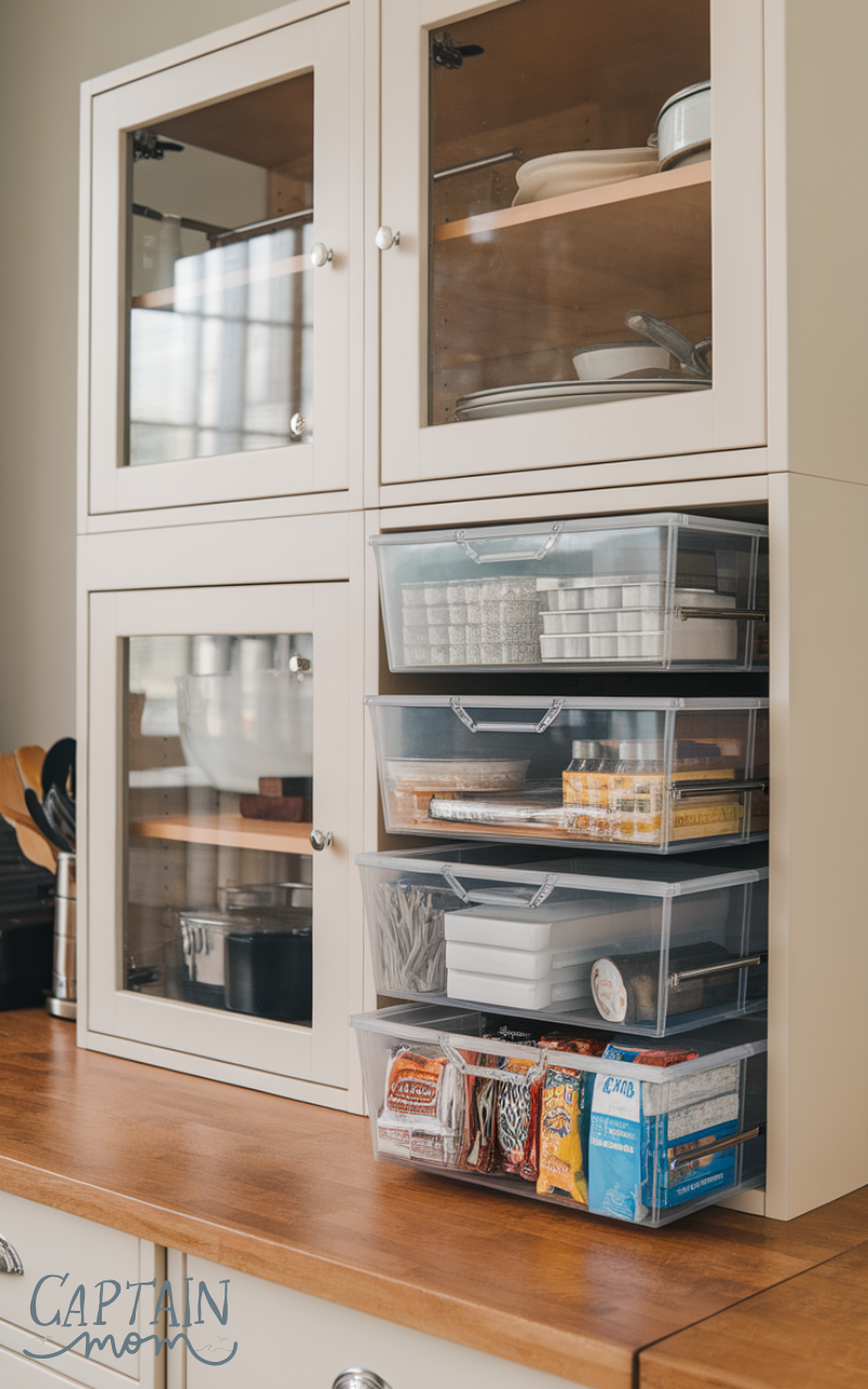 Clear stackable drawers inside cabinets are practical kitchen organization with limited cabinet space solutions. They separate items like snacks, baking supplies, or utensils while maintaining visibility. Stackable design optimizes vertical space, keeps items organized, and makes it easy to retrieve what you need. This low-cost, adaptable system is perfect for kitchens where traditional cabinets aren’t enough for all your essentials.