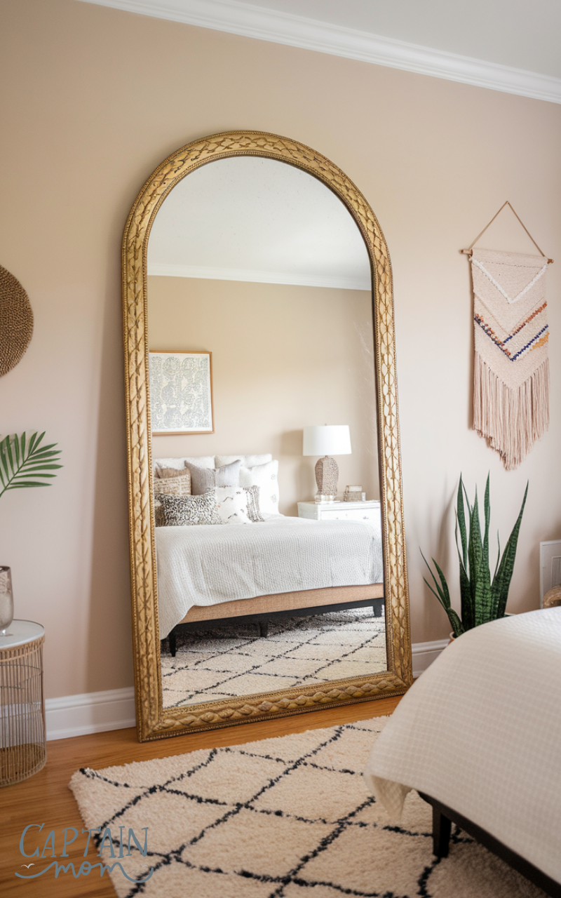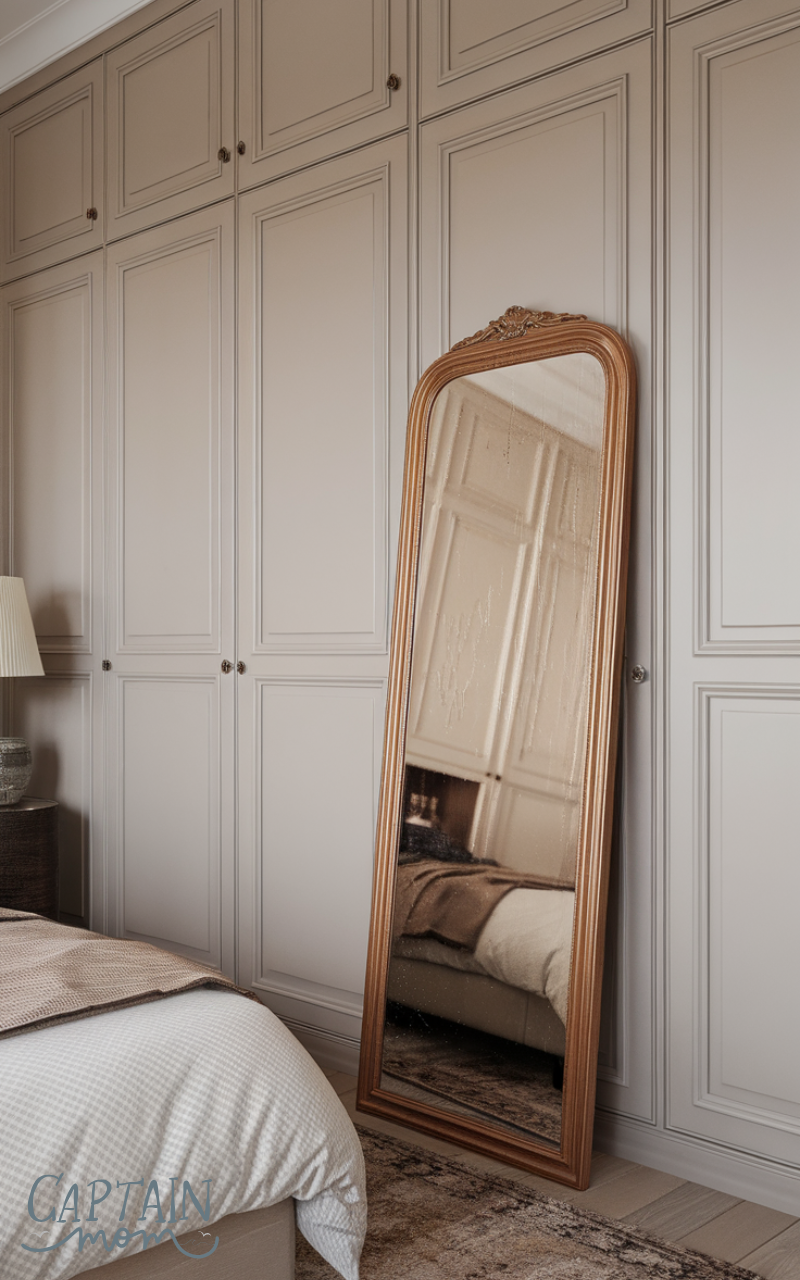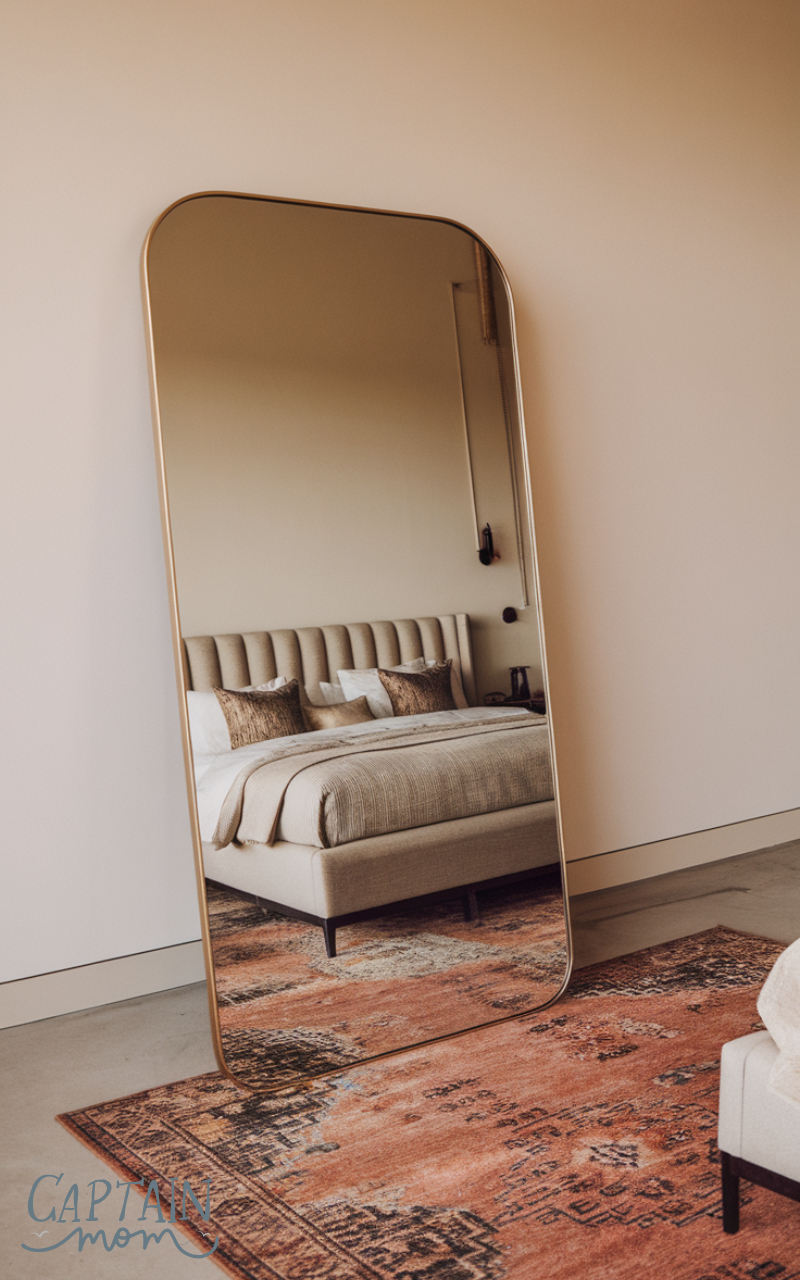 When I think through Bedroom Floor Mirror Placement, I personally rule out ceiling mirrors right away, they always feel forced and distracting. A thin standing mirror floating randomly doesn’t work for me either, especially in a smaller room where it can feel cramped. I like the idea of a larger floor mirror placed flat against a wall, either beside the bed or near the foot of it, where it feels grounded and practical. This kind of Bedroom Floor Mirror Placement gives flexibility without locking the room into one specific vibe, and it still feels tasteful and grown-up.