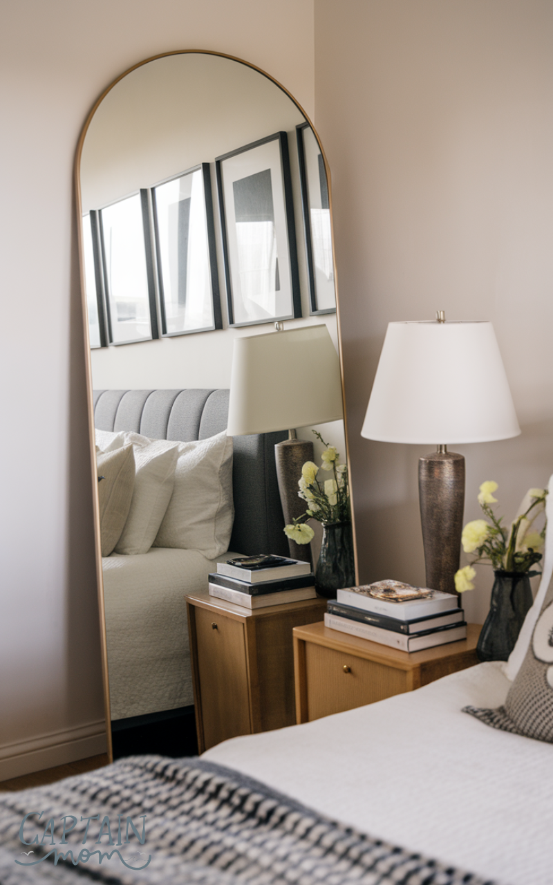 Placing a floor mirror in a quiet corner is a soft and elegant proper bedroom floor mirror placement that reflects light without overwhelming the space. This position works beautifully in small bedrooms because it creates depth while keeping traffic flow smooth around the bed and furniture. When you lean the mirror slightly against the wall, it feels relaxed and stylish rather than rigid. A corner placement also helps bounce natural light from a nearby window across the room, making everything feel airier, brighter, and more open. With the right frame, this proper bedroom floor mirror placement can become a subtle decorative feature that blends with your color palette and adds warmth, charm, and personality to your bedroom.