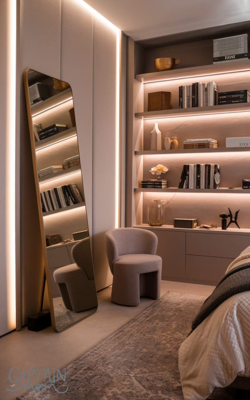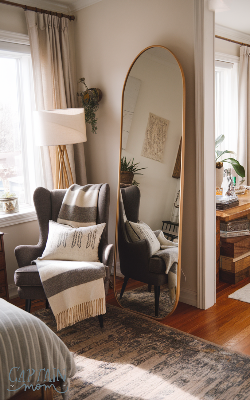 Placing a floor mirror next to a cozy chair creates a relaxed proper bedroom floor mirror placement that feels like a mini lounge area. This setup invites you to sit, read, and enjoy the reflection of your space, making the room feel layered and thoughtful. The mirror reflects your chair, throw blanket, or pillow, enhancing the overall décor. It also helps light travel around the seating area, making it brighter and more welcoming. This placement is perfect for bedrooms that double as personal retreat spaces. Overall, this proper bedroom floor mirror placement adds comfort, style, and personality without overcrowding your room.