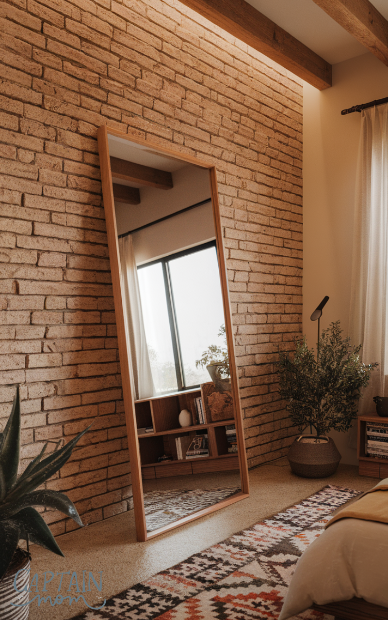 Leaning your floor mirror against a textured wall, such as brick, wood, or paneling, is an artistic proper bedroom floor mirror placement that adds character. The mirror contrasts beautifully with rough or patterned surfaces, creating depth and visual interest. Instead of hanging art, the mirror becomes your décor statement. This placement highlights architectural details while still serving its practical purpose. A simple frame works best so the wall texture remains the star. This proper bedroom floor mirror placement is ideal for modern lofts, rustic rooms, or creative spaces that celebrate unique materials and design.