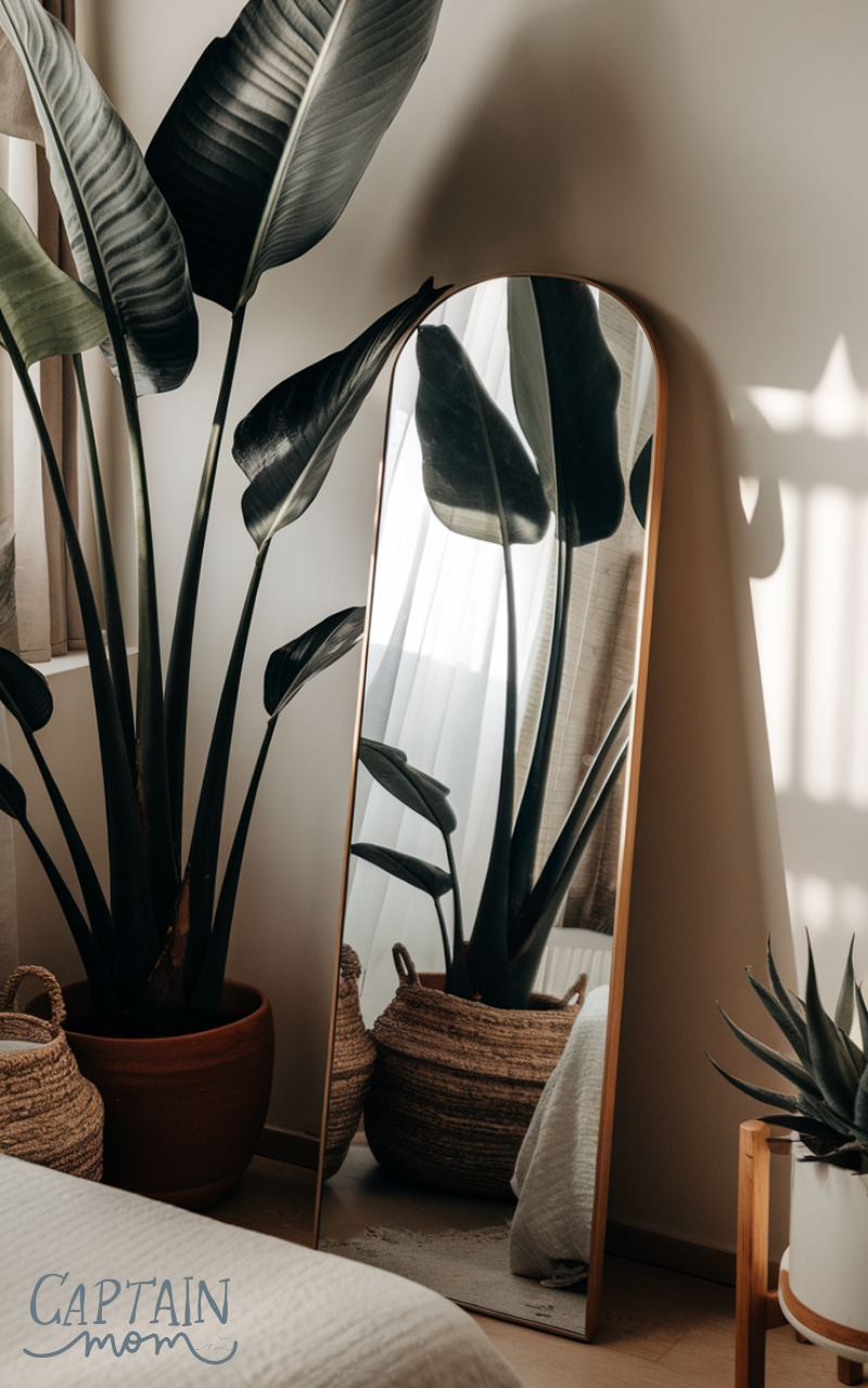 Positioning your floor mirror behind or beside tall plants is a beautiful proper bedroom floor mirror placement that doubles the greenery visually. The mirror reflects leaves, shadows, and textures, making your bedroom feel like a fresh indoor garden. This approach softens the look of the mirror while adding warmth and life to the space. It works perfectly in boho, natural, or minimalist bedrooms where organic elements shine. The mirror also helps light bounce through the foliage, creating gentle, calming reflections. This proper bedroom floor mirror placement transforms a simple décor idea into a dynamic, peaceful, and visually rich corner of your room.