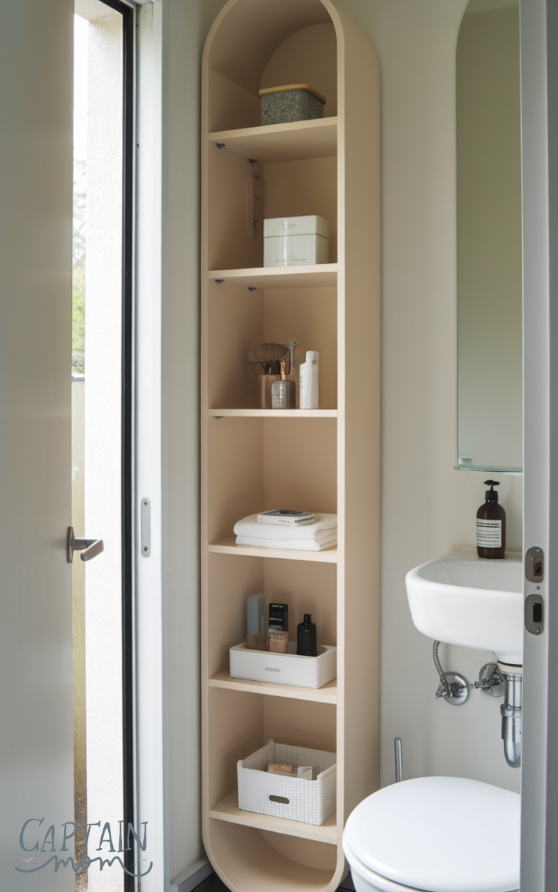 A tall, narrow storage tower is the ultimate solution for small spaces. It’s one of the best tiny powder room storage ideas for maximizing vertical height. These towers fit into tight corners and offer multiple shelves for storage. Choose a slim design with doors to hide clutter. Tiny powder room storage ideas that go vertical make even the smallest powder room feel organized and functional.