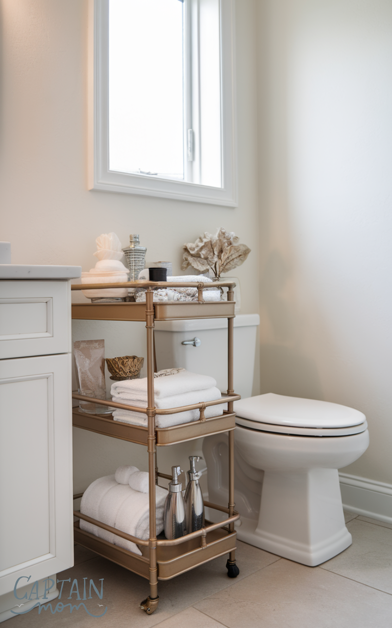 A slim rolling cart can slide between tight spaces, making it one of the most flexible tiny powder room storage ideas. It can fit beside the toilet or vanity and hold towels, toiletries, or decorative items. The best part is that it’s movable, so you can reposition it when needed. Choose a narrow design with multiple tiers for maximum storage. Tiny powder room storage ideas that include movable pieces add both convenience and versatility.