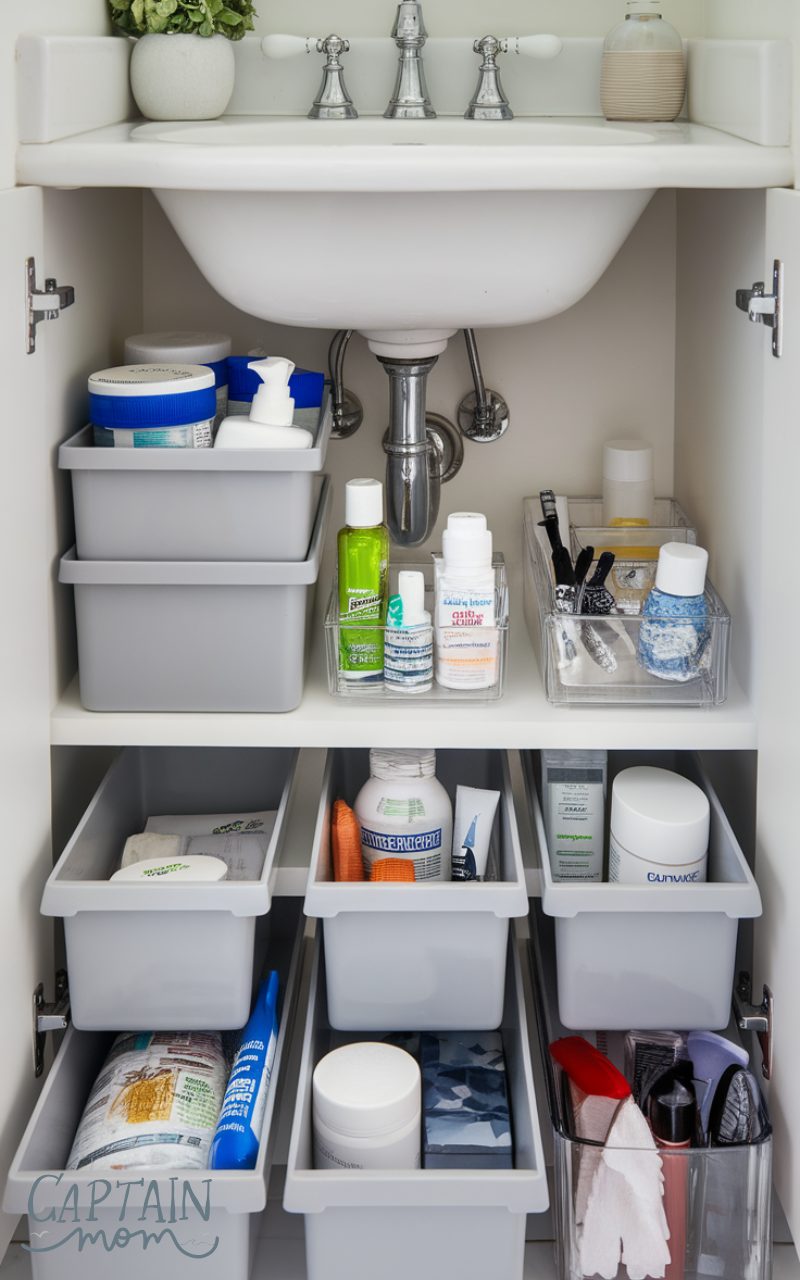 The space under the sink often becomes messy, but it holds great potential. Using stackable bins or pull-out drawers is one of the most practical tiny powder room storage ideas. Organizers help separate cleaning products, toiletries, and extra supplies. Clear containers make it easy to see what you have. This simple upgrade instantly makes your powder room more functional. Tiny powder room storage ideas like this focus on improving what you already have.