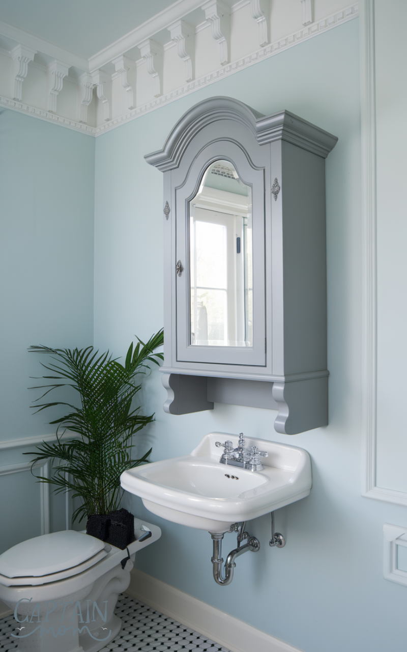 Wall-mounted cabinets are perfect when floor space is limited. These tiny powder room storage ideas keep essentials tucked away while maintaining a clean look. A slim cabinet above the sink or beside the mirror can store toiletries and cleaning supplies. Opt for mirrored cabinet doors to reflect light and make the room feel larger. Among tiny powder room storage ideas, wall-mounted cabinets provide hidden storage without making the space feel crowded.