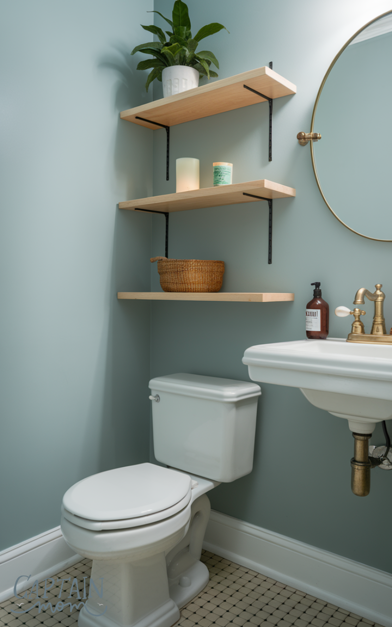 Floating corner shelves are one of the best tiny powder room storage ideas because they use space that usually goes unused. Corners are often forgotten, but adding slim floating shelves instantly creates room for décor, candles, hand towels, or small baskets. Choose light wood or white shelves to keep the room feeling open and airy. These shelves don’t take up floor space, which makes them perfect for small bathrooms. Among tiny powder room storage ideas, this option is stylish, affordable, and easy to install.