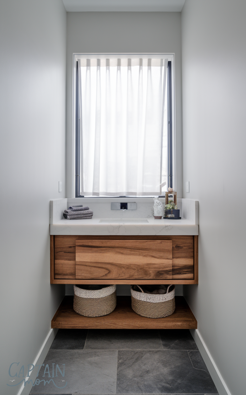 A floating vanity creates the illusion of more space while providing storage underneath. This is one of the most modern tiny powder room storage ideas. You can store baskets below or leave it open for a clean look. The exposed floor makes the room appear larger and less crowded. Tiny powder room storage ideas like floating vanities are perfect for contemporary small bathrooms.