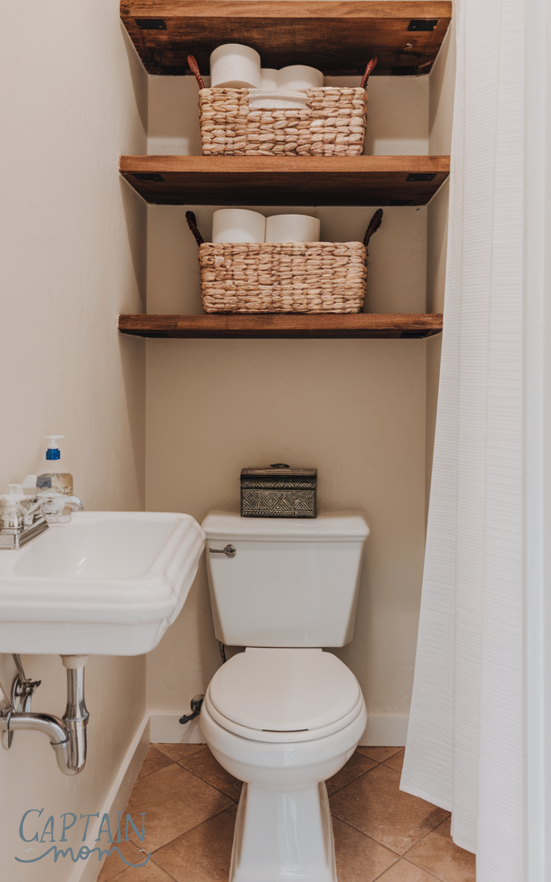 The area above the toilet is prime real estate in small bathrooms. Installing an over-the-toilet shelving unit is one of the smartest tiny powder room storage ideas. You can store extra toilet paper, folded towels, and decorative items without crowding the room. Choose open shelves for a modern look or a cabinet style for hidden storage. This solution keeps everything organized while maximizing vertical space. Tiny powder room storage ideas like this help you think upward instead of outward.