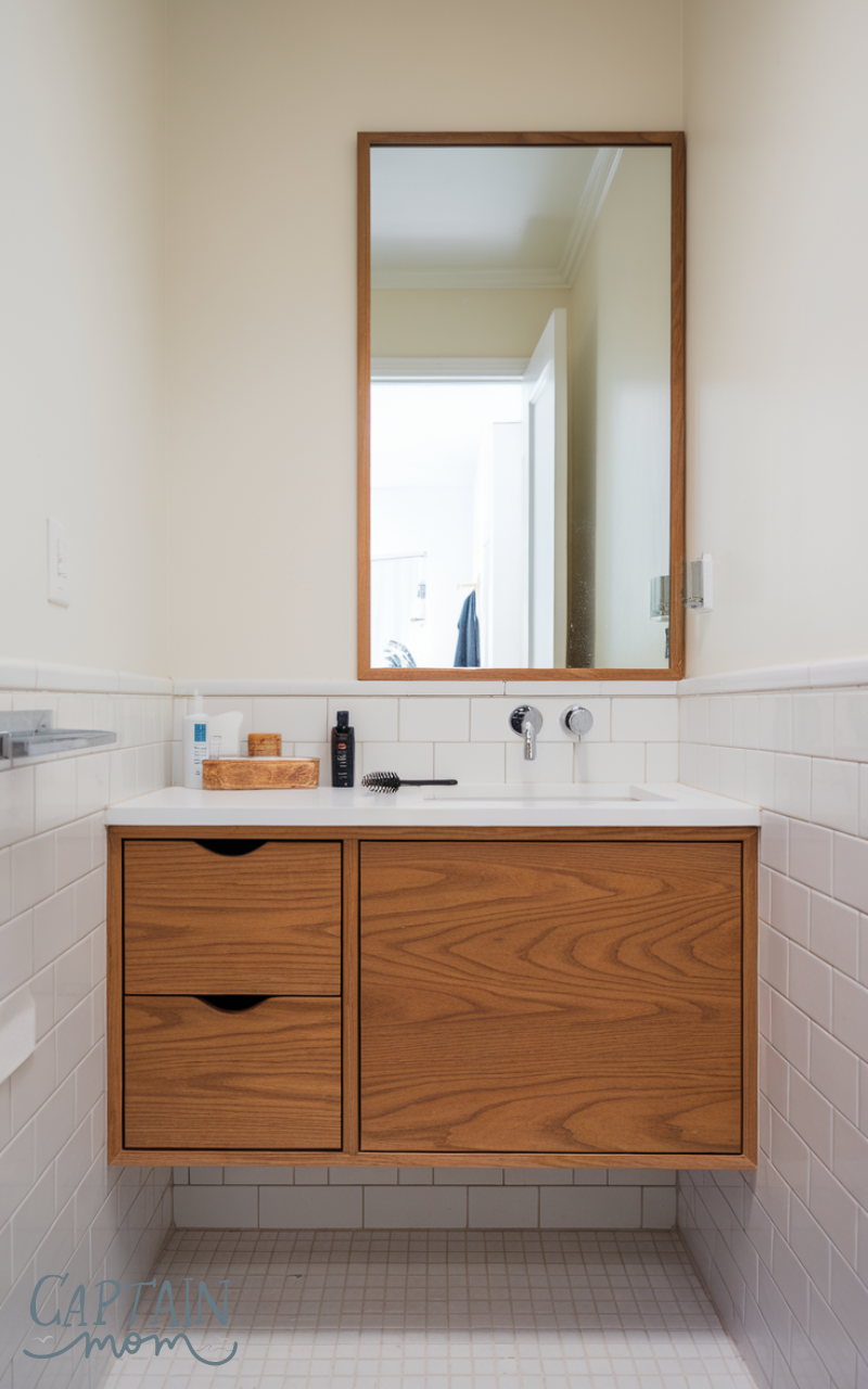 If you’re renovating, consider a vanity with built-in drawers. These tiny powder room storage ideas help you organize makeup, hair tools, and toiletries efficiently. Deep drawers with dividers maximize every inch. Choose a compact vanity designed specifically for small bathrooms. Among tiny powder room storage ideas, this option offers both functionality and a polished look.