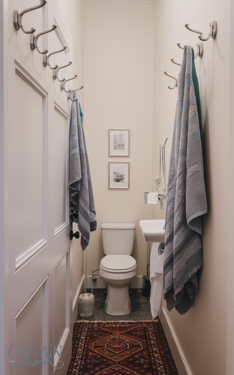 Don’t forget the back of the door. Adding hooks is one of the simplest tiny powder room storage ideas. You can hang towels, robes, or storage bags without taking up any visible space. Choose sleek metal hooks or a full over-the-door rack. This easy solution keeps clutter off the floor and adds instant organization. Tiny powder room storage ideas that use hidden spaces make a big difference in small rooms.