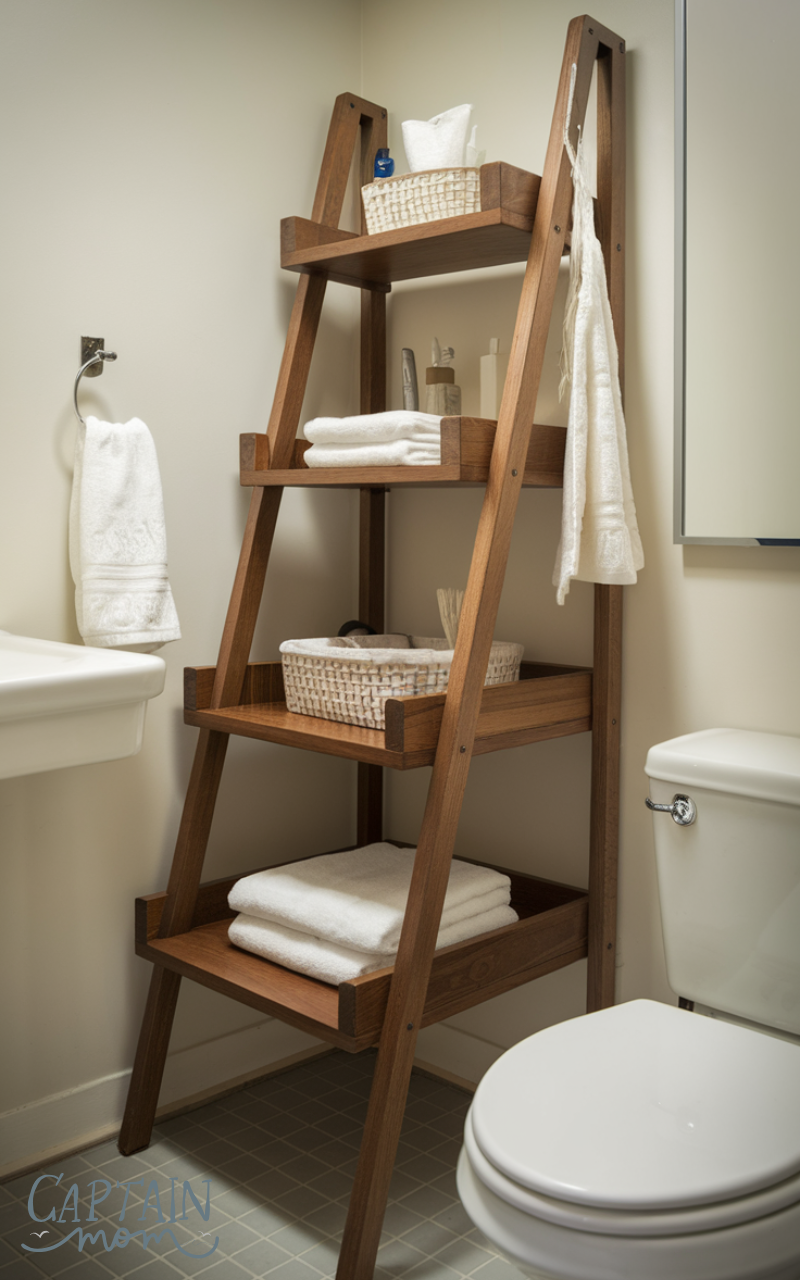 A leaning ladder shelf adds charm while offering vertical storage. This is one of the most decorative tiny powder room storage ideas. Use it to hang towels and place small baskets on the shelves. Its open design keeps the room feeling light and airy. Choose a slim ladder that doesn’t overwhelm the space. Tiny powder room storage ideas like this combine practicality with stylish design.