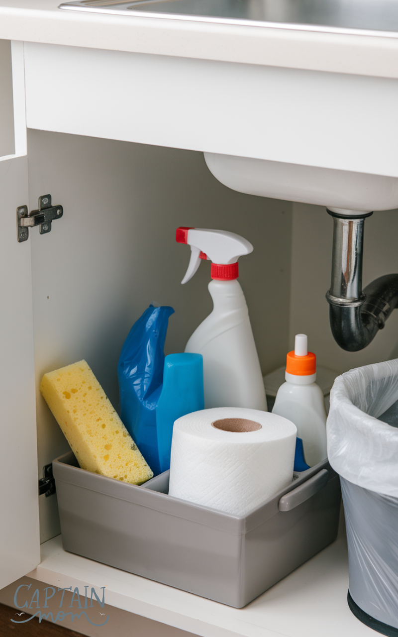 Finally, designate a small kitchen zone for cleaning supplies like sprays, towels, and trash bags. Keep them tucked under the sink or in a small caddy. This ensures everything is handy without cluttering your countertops or cabinets.