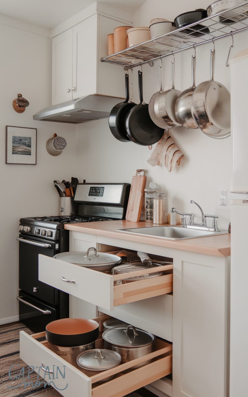 Deep drawers work wonderfully because they allow you to stack neatly without losing visibility. If cabinets are your only option, consider adding vertical dividers for lids. Hanging racks can also maximize wall space. When cookware has a proper home, your cabinets feel twice as spacious.