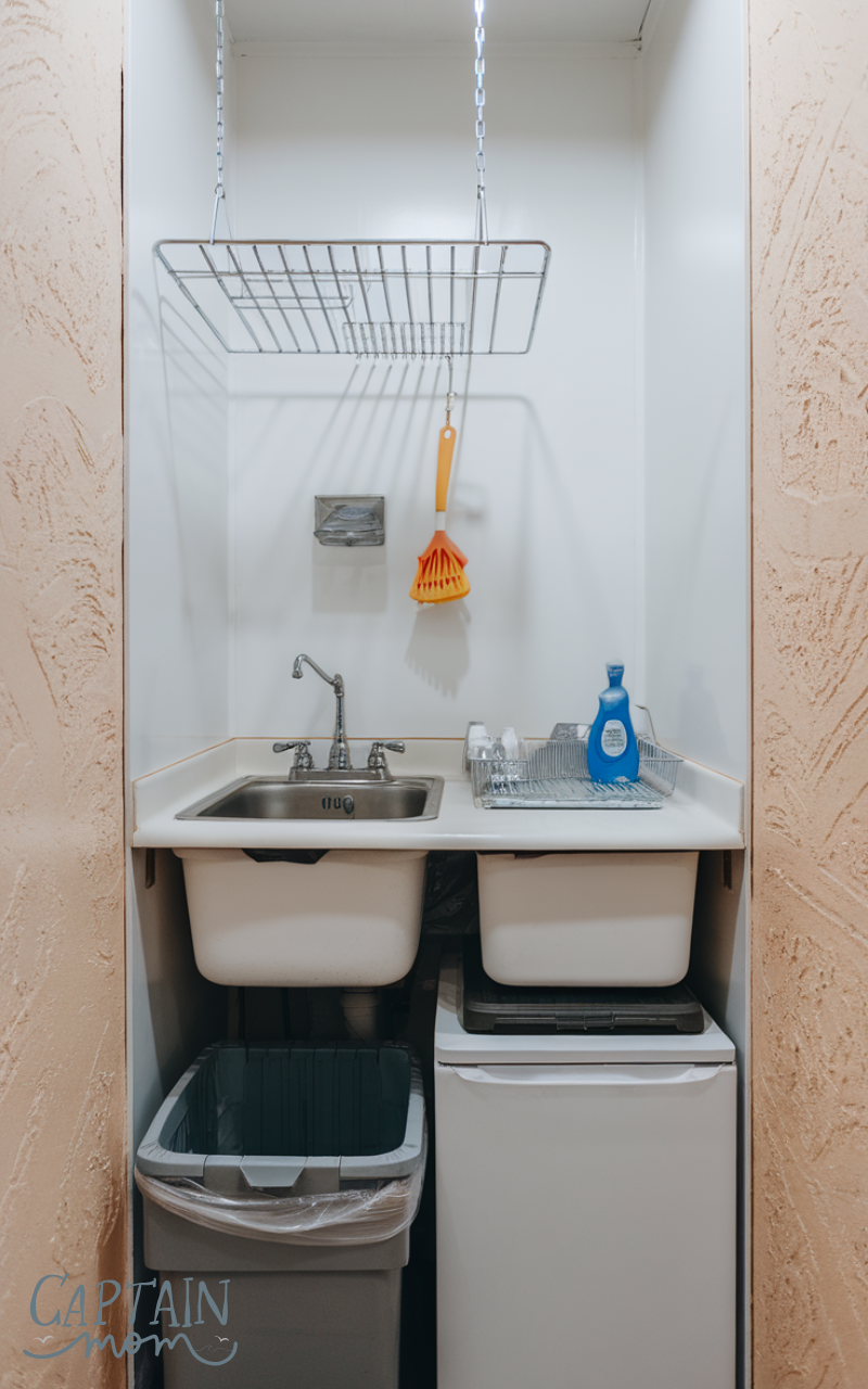 Store dish soap, sponges, and scrub brushes in a small caddy under the sink. If space allows, add a small pull-out trash bin to keep everything hidden but accessible. This Small Kitchen Zone keeps mess contained and prevents dirty dishes from spreading across your counters.
