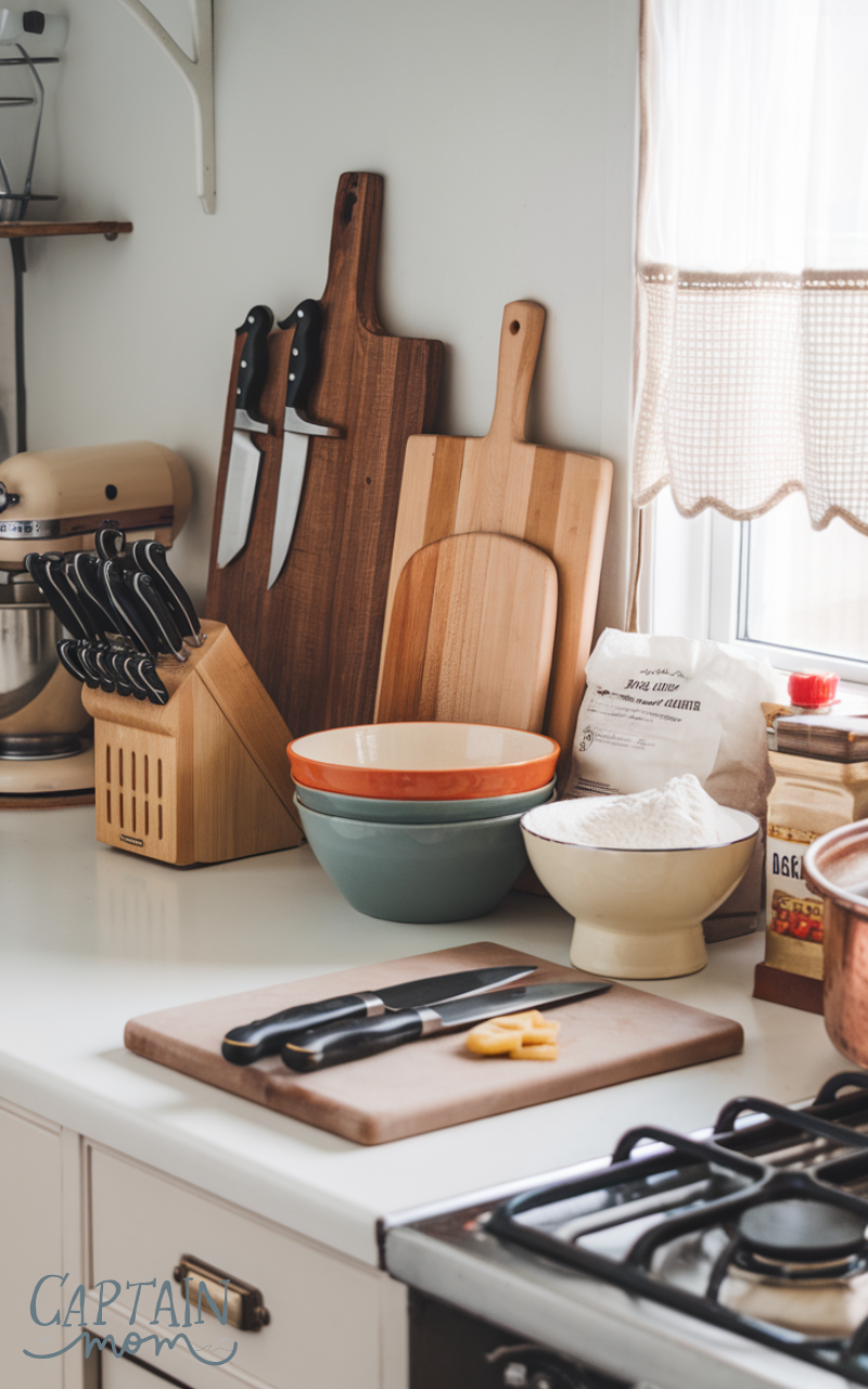 I keep my cutting boards upright in a slim rack and store knives safely in a drawer insert or magnetic strip nearby. Mixing bowls, measuring cups, and colanders should live close to this area too. When your prep zone is organized, you spend less time searching and more time actually enjoying the cooking process.