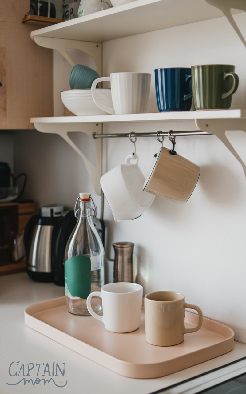 You can even use a small tray to anchor everything visually. If you have kids, store reusable water bottles nearby for easy access. This Small Kitchen Zone prevents traffic jams during busy mornings and keeps countertops from becoming cluttered.