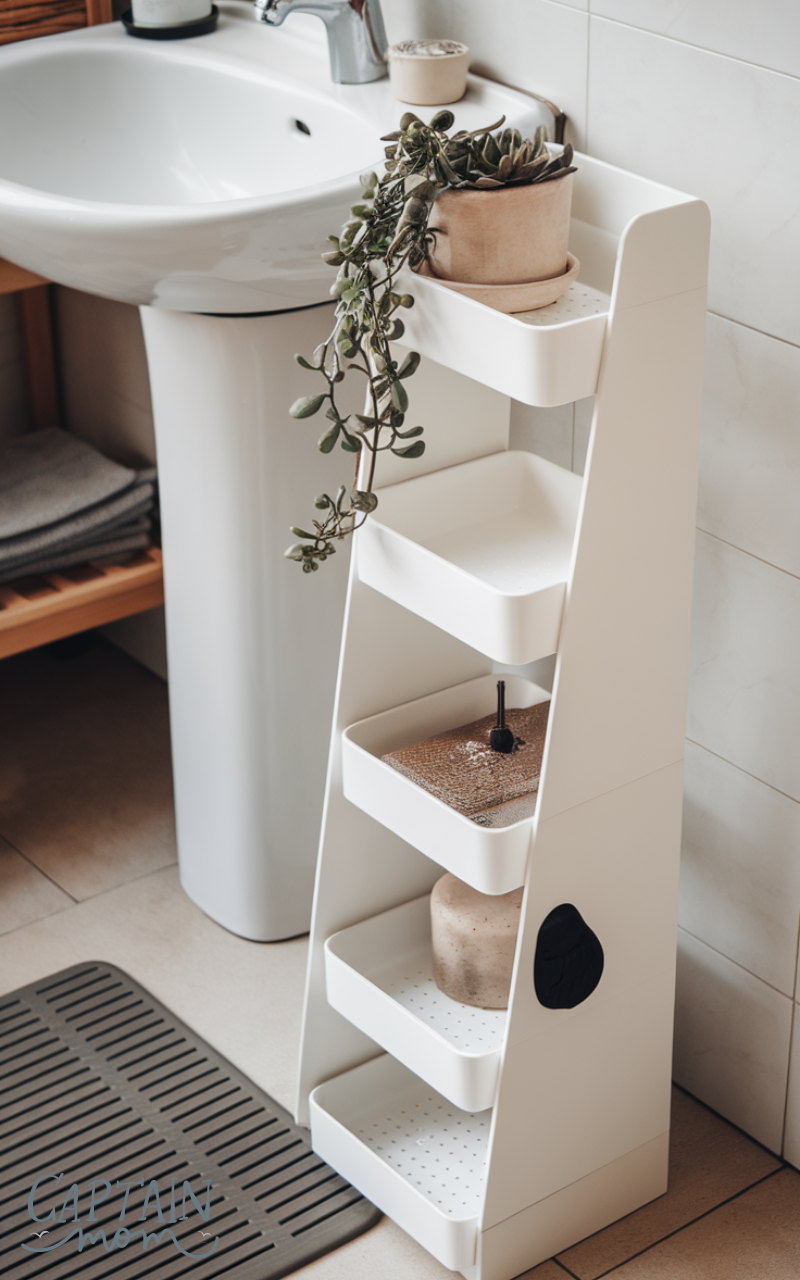 A slim vertical storage tower is the ultimate bathroom with no cabinets storage solutions choice. These tall, narrow units fit into tight spaces while offering multiple shelves for storage. They’re perfect beside sinks or toilets. The vertical design keeps the footprint small but storage capacity high. It’s a practical and stylish way to keep your bathroom neat and functional.