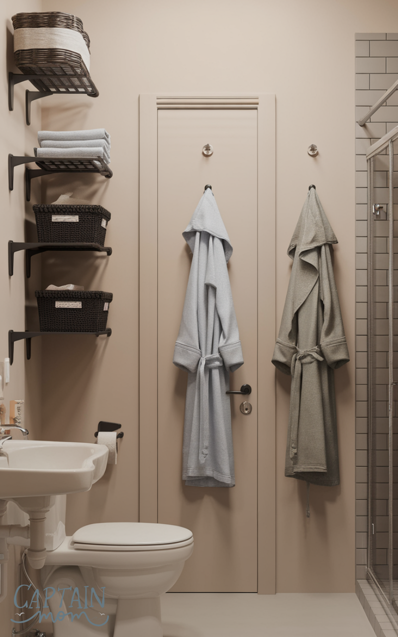 Hooks are underrated bathroom with no cabinets storage solutions. Install them behind the door or on empty walls to hang towels, robes, and even storage baskets. Wall-mounted racks keep items off the floor and reduce clutter. They are simple to install and extremely affordable. Hooks are especially helpful in shared bathrooms where multiple people need easy access to towels and essentials.