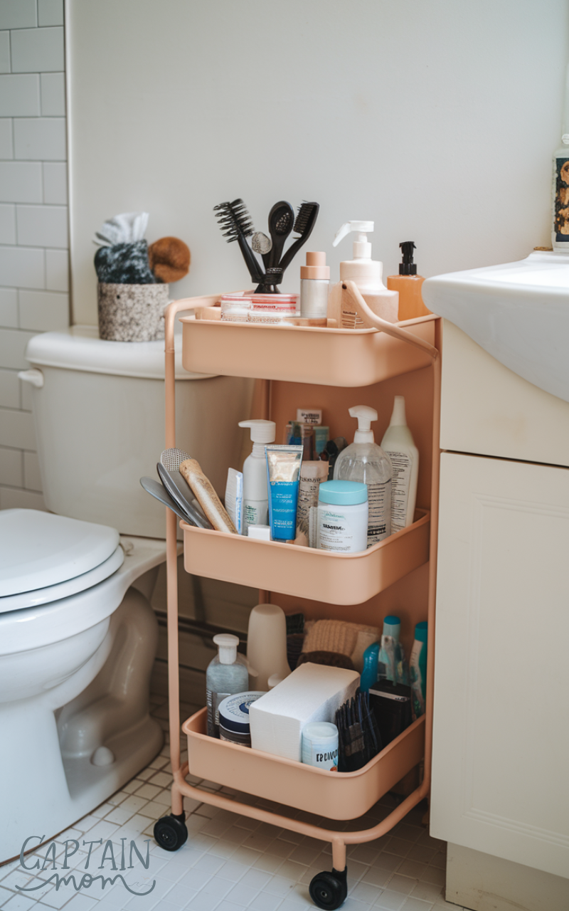 A slim rolling cart is one of the most versatile bathroom with no cabinets storage solutions. It can fit between the toilet and sink or slide into tight spaces. Use it to organize hair tools, skincare products, cleaning supplies, and extra paper. Since it has wheels, you can move it around easily. This solution is perfect for small bathrooms because it maximizes narrow gaps that usually go unused.