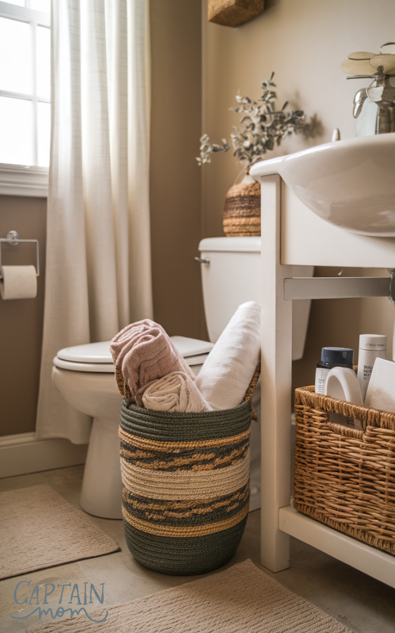 Decorative baskets are affordable and flexible bathroom with no cabinets storage solutions. Place them under the sink, beside the toilet, or in empty corners. Use woven baskets for towels and larger items, and smaller bins for toiletries. Baskets hide clutter while keeping things easy to grab. They also add warmth and texture to the bathroom design. This simple solution works especially well in cozy or farmhouse-style bathrooms.