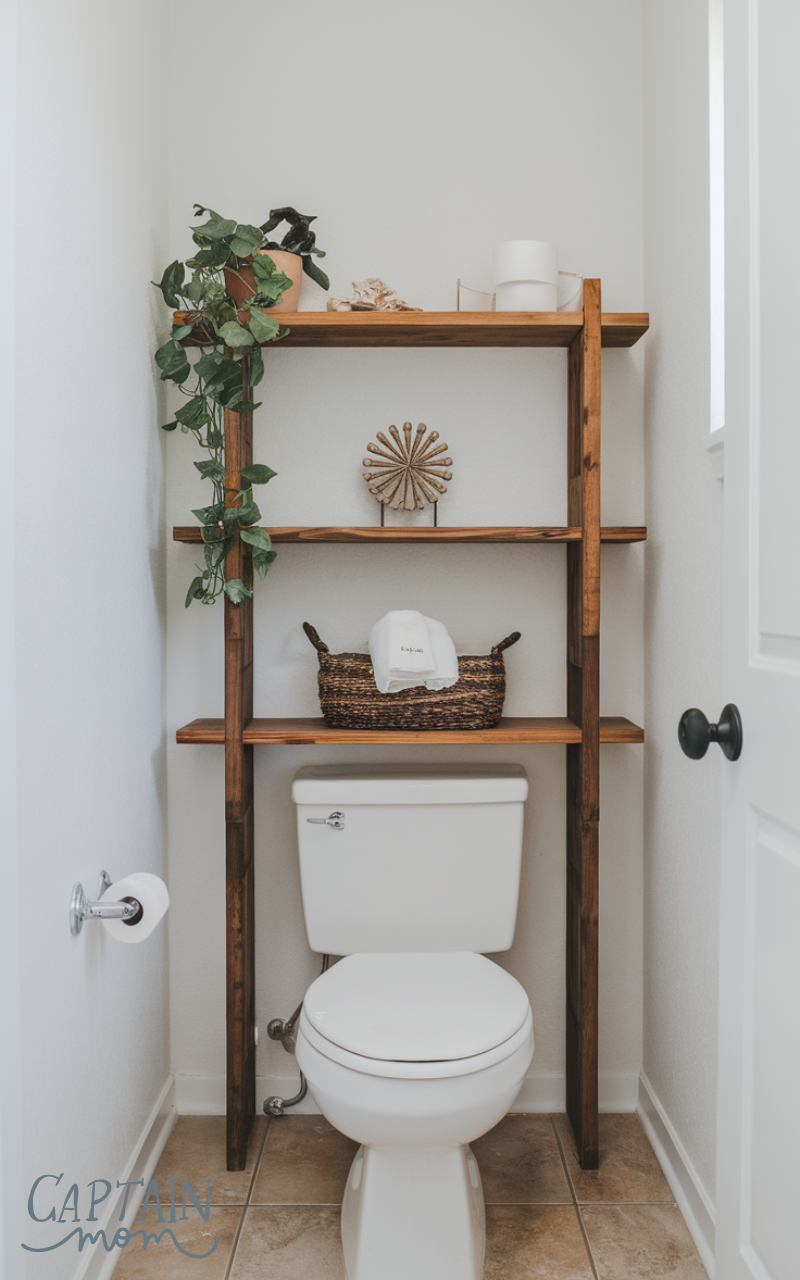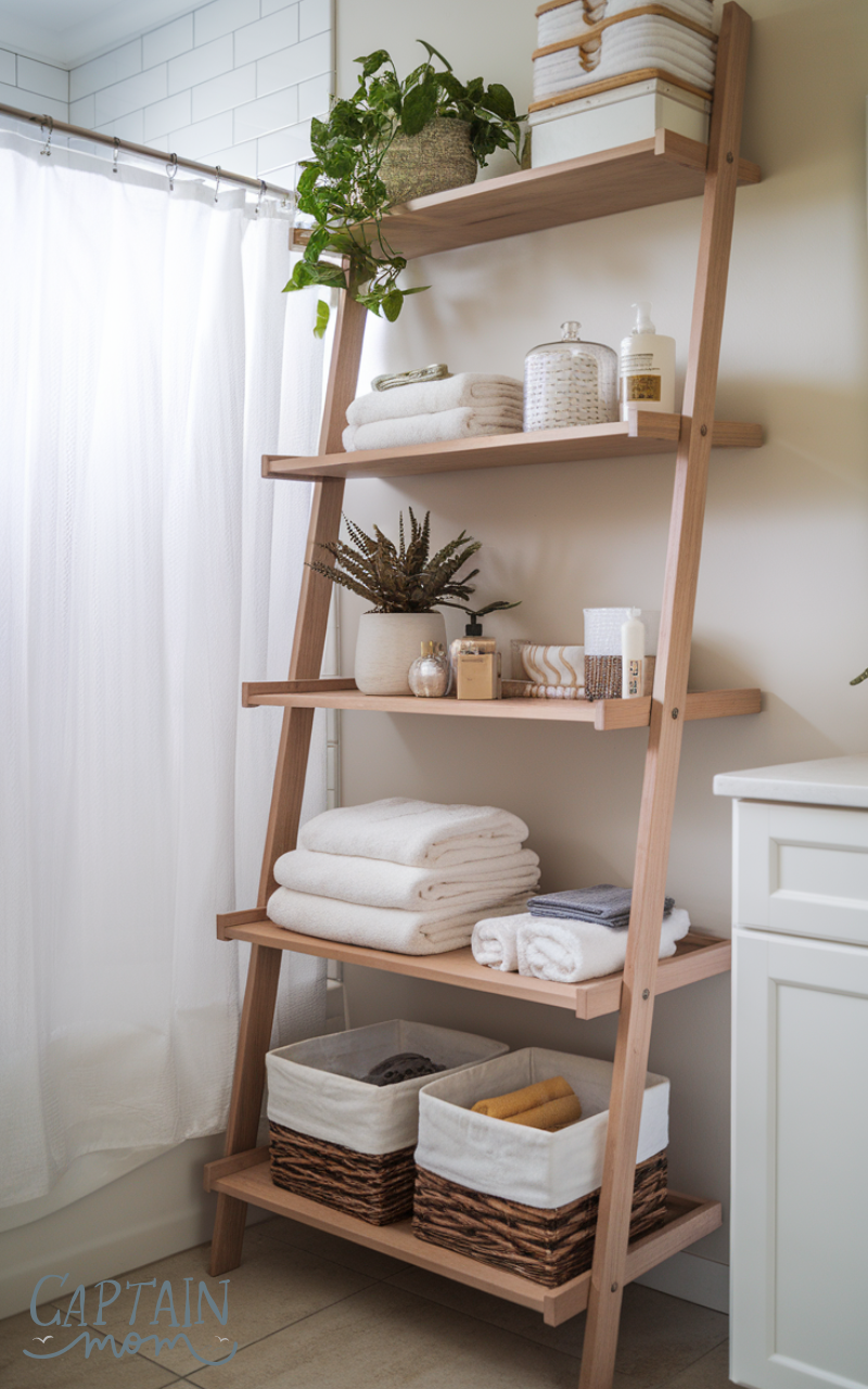 A leaning ladder shelf is a stylish and practical bathroom with no cabinets storage solutions idea. It provides multiple tiers for towels, plants, baskets, and daily essentials. Since it leans against the wall, it doesn’t require heavy installation. This makes it perfect for renters. Ladder shelves add height and visual interest while keeping your items organized. It’s an elegant way to combine décor and storage in one piece.