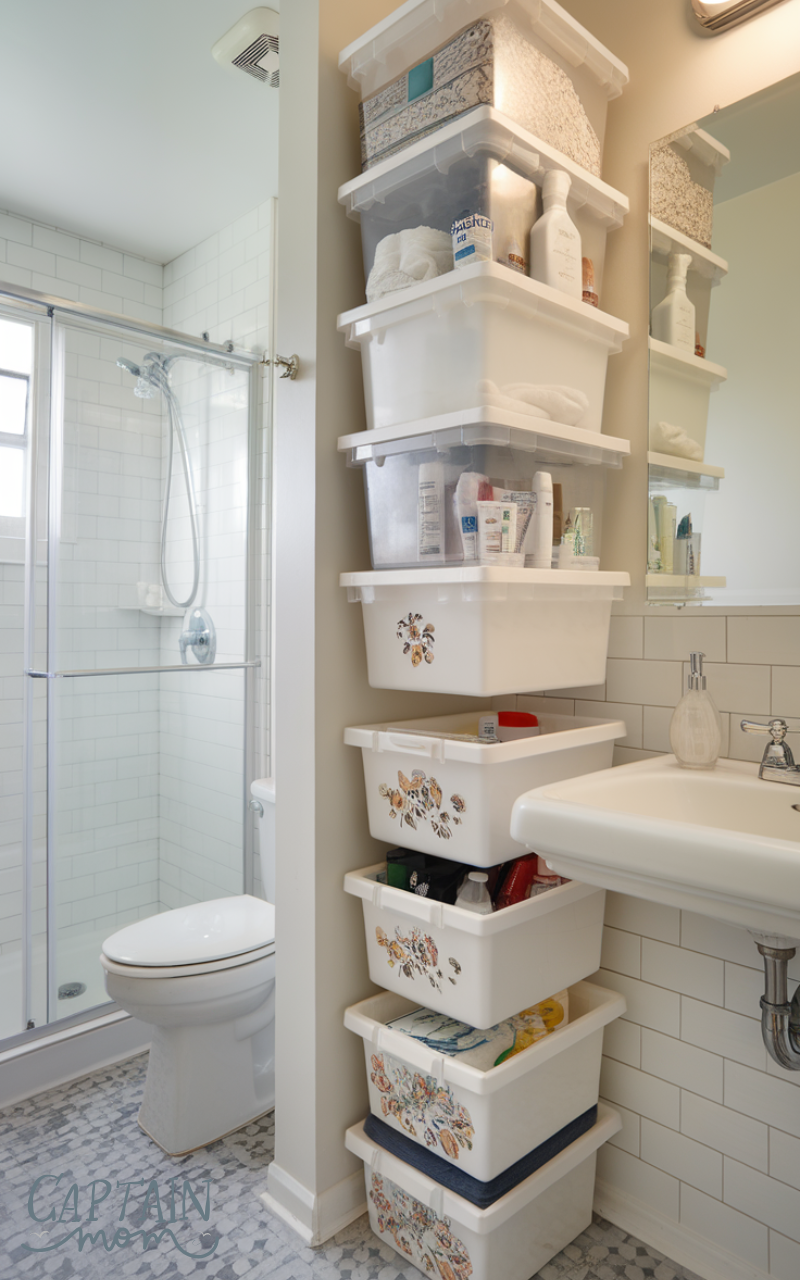 Stackable bins are flexible bathroom with no cabinets storage solutions that grow with your needs. Use clear bins to see contents easily or decorative ones for style. Stack them vertically in corners or under sinks. They help categorize products and prevent clutter from spreading. This solution is affordable and adaptable for any bathroom size.