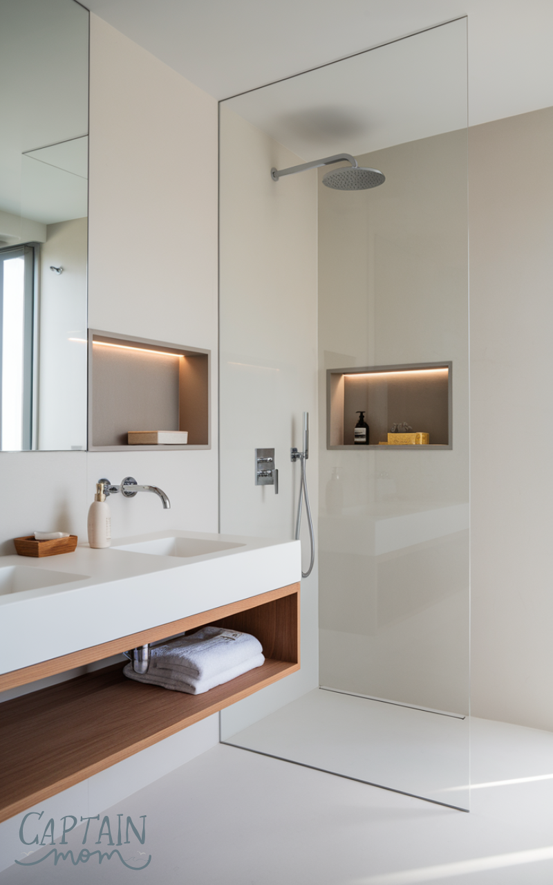 Built-in wall niches are sleek and modern bathroom with no cabinets storage solutions. If you’re renovating, consider adding recessed shelves inside the wall. They provide storage without protruding into the room. Wall niches work beautifully in showers or above sinks. They create a clean, high-end look while offering practical storage.