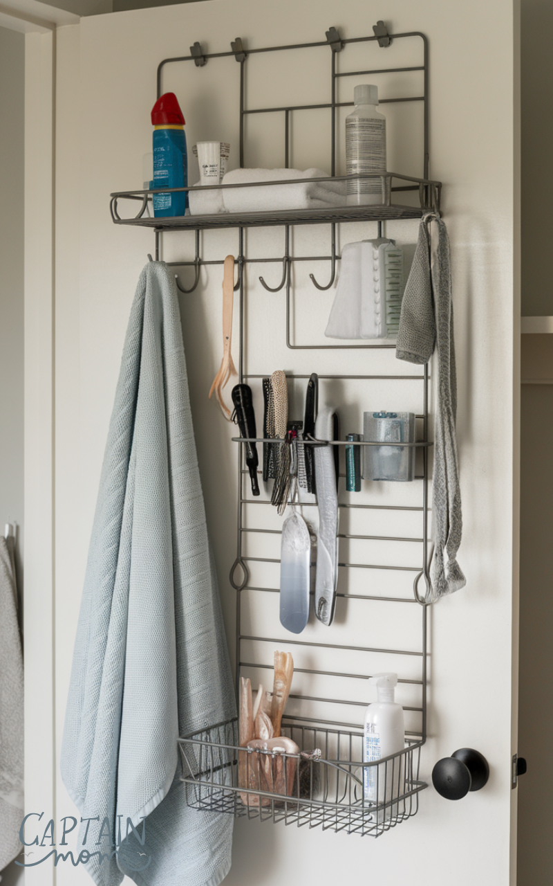 An over-the-door organizer is one of the easiest bathroom with no cabinets storage solutions to install. Use it for towels, hair tools, or cleaning supplies. It doesn’t require drilling, making it ideal for renters. This solution keeps items organized while freeing up wall and floor space. It’s simple but highly effective.