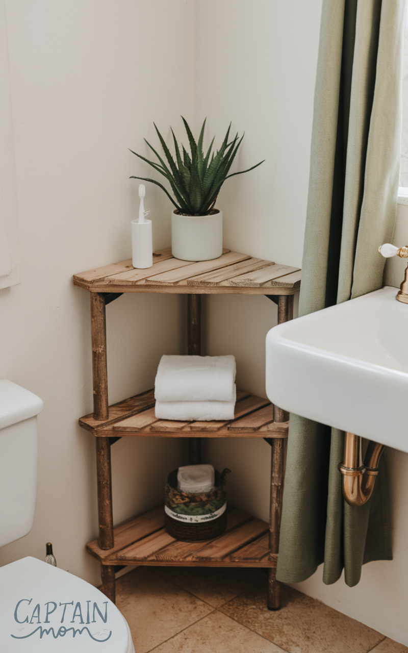 Corners are often wasted space, but corner shelves are clever bathroom with no cabinets storage solutions. Install triangular or curved shelves to hold toiletries and décor. They maximize awkward areas and make the bathroom feel thoughtfully designed. Corner shelving works especially well in small bathrooms where traditional storage units won’t fit.