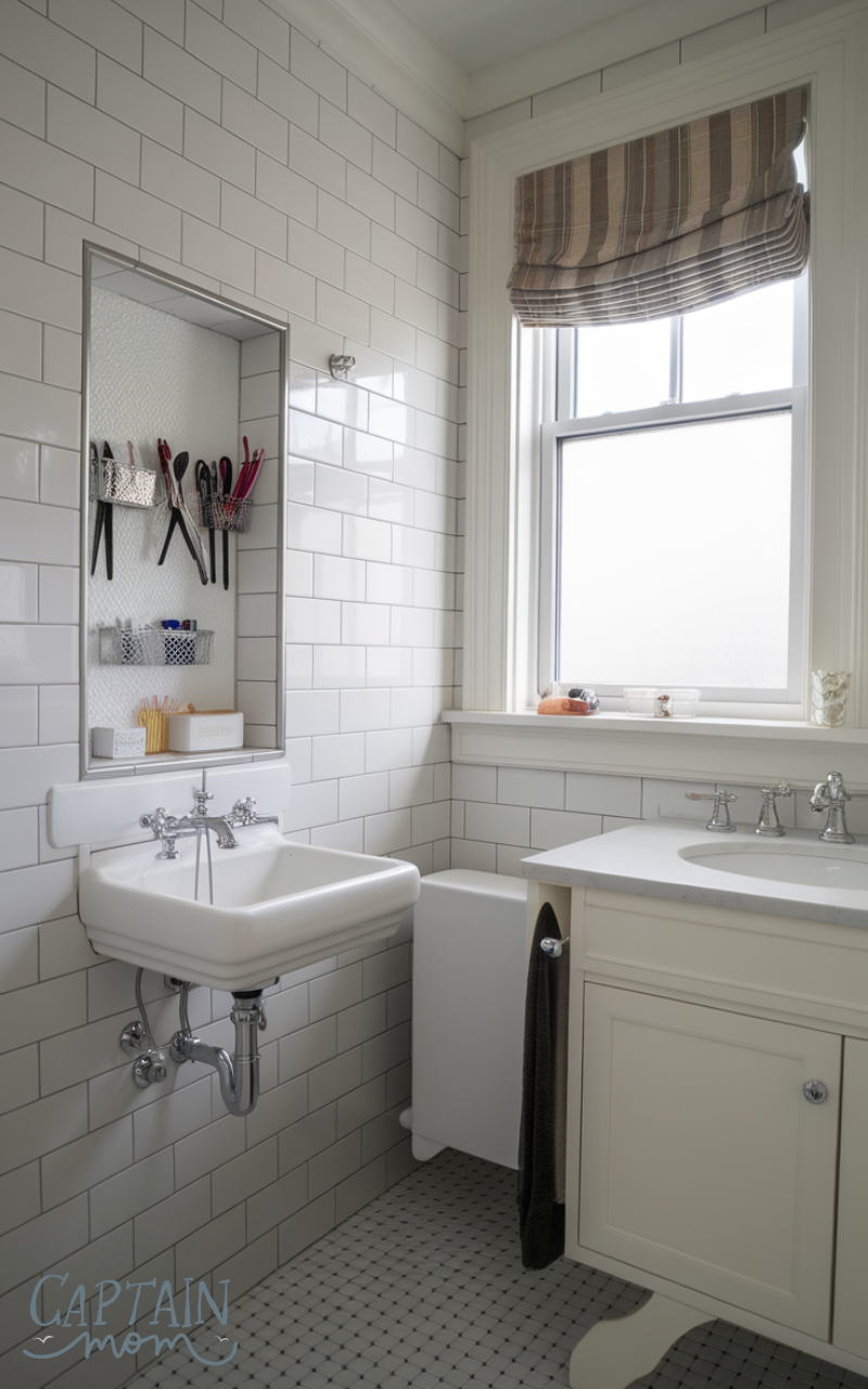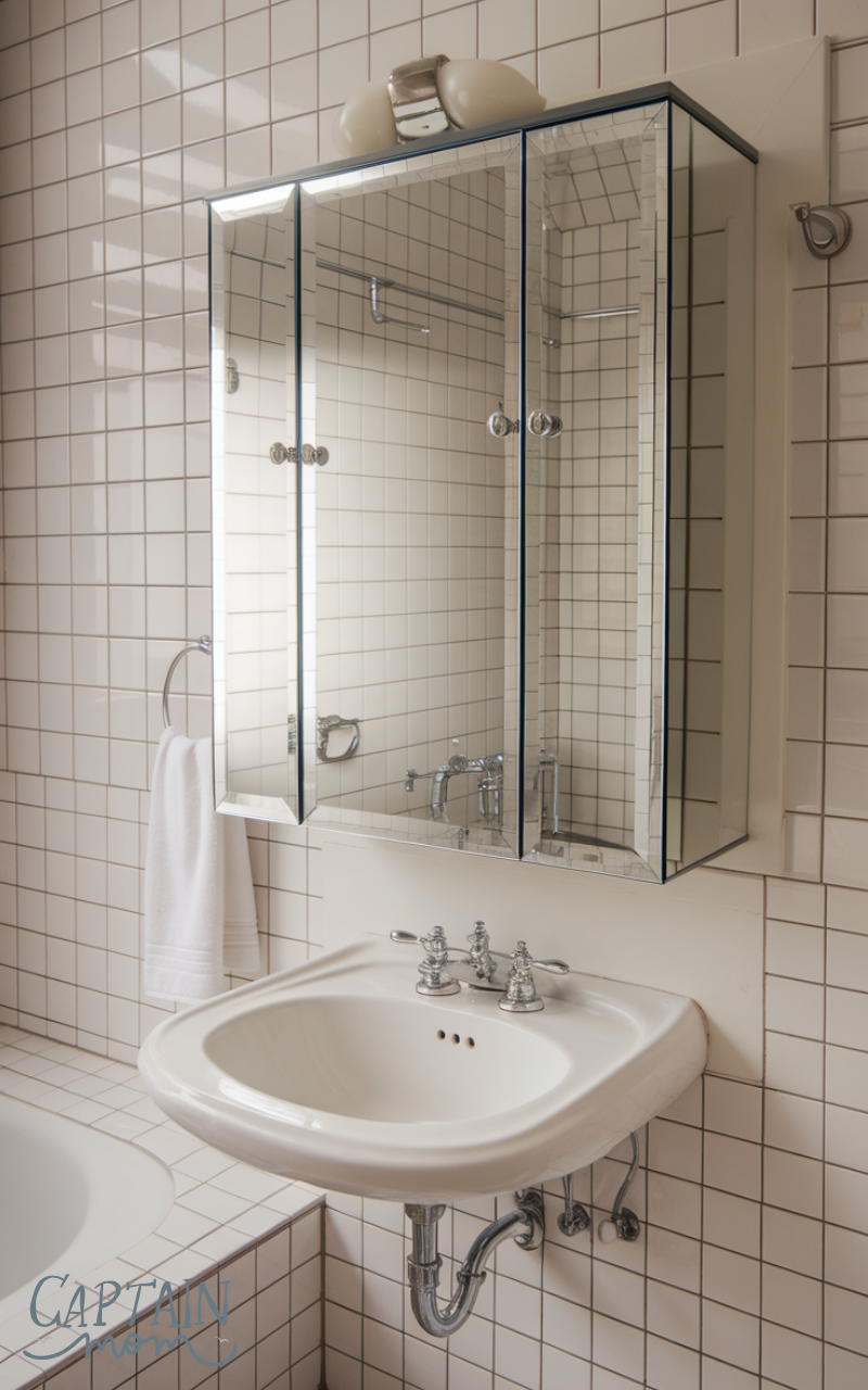 A mirrored medicine cabinet is a hidden gem among bathroom with no cabinets storage solutions. It provides storage behind the mirror without taking up extra room. You can store toothbrushes, skincare, and small toiletries discreetly. This option keeps the countertop clear and creates a sleek, organized appearance. It’s perfect for minimalist bathrooms that need storage without visible clutter.