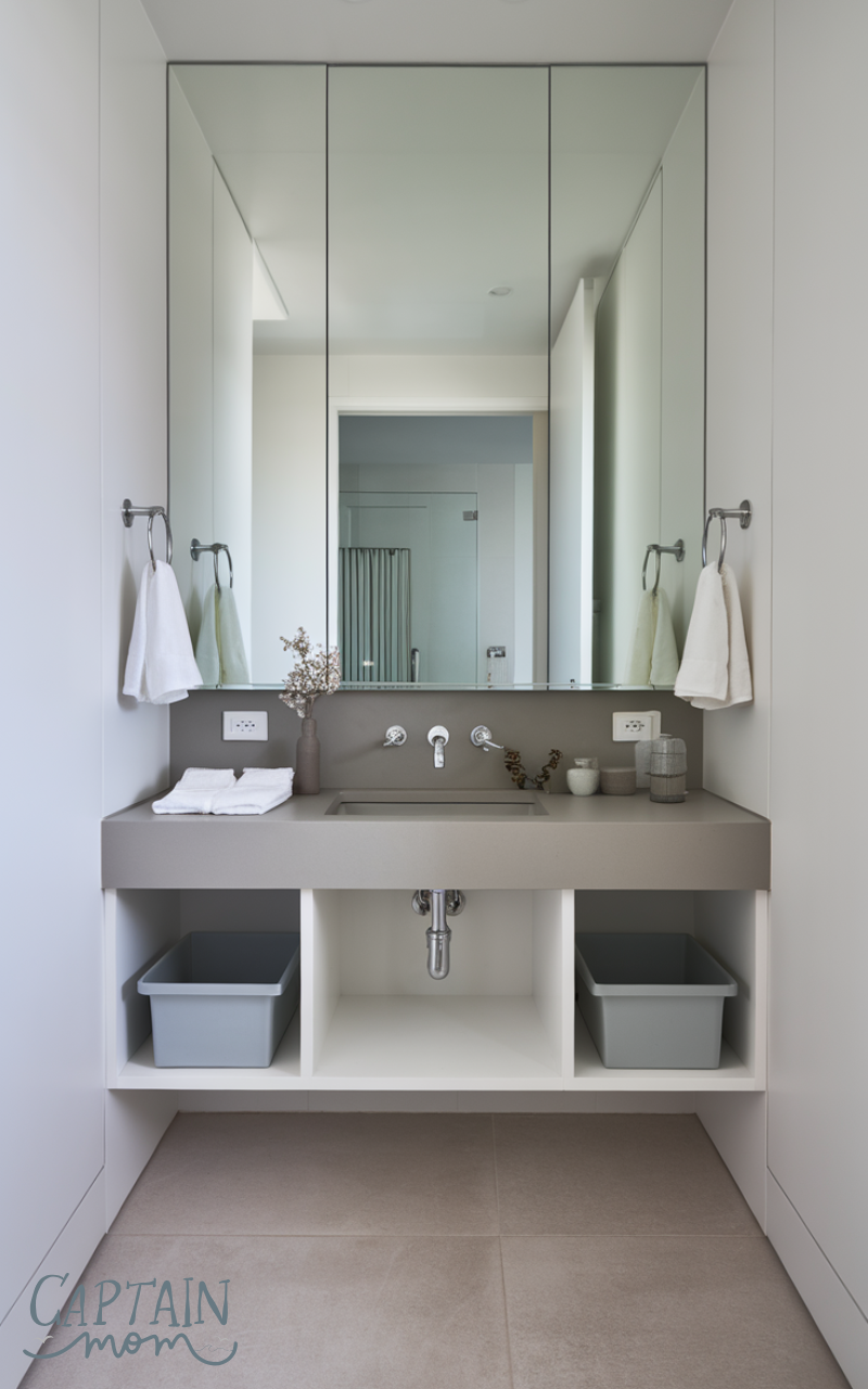 If your sink doesn’t have cabinets, add open shelving underneath. This is one of the most practical bathroom with no cabinets storage solutions because it uses existing space efficiently. Install a simple shelf around the plumbing and add bins for organization. Open shelving makes items easy to find and keeps the space feeling airy instead of cramped. It’s a great balance between functionality and modern design.