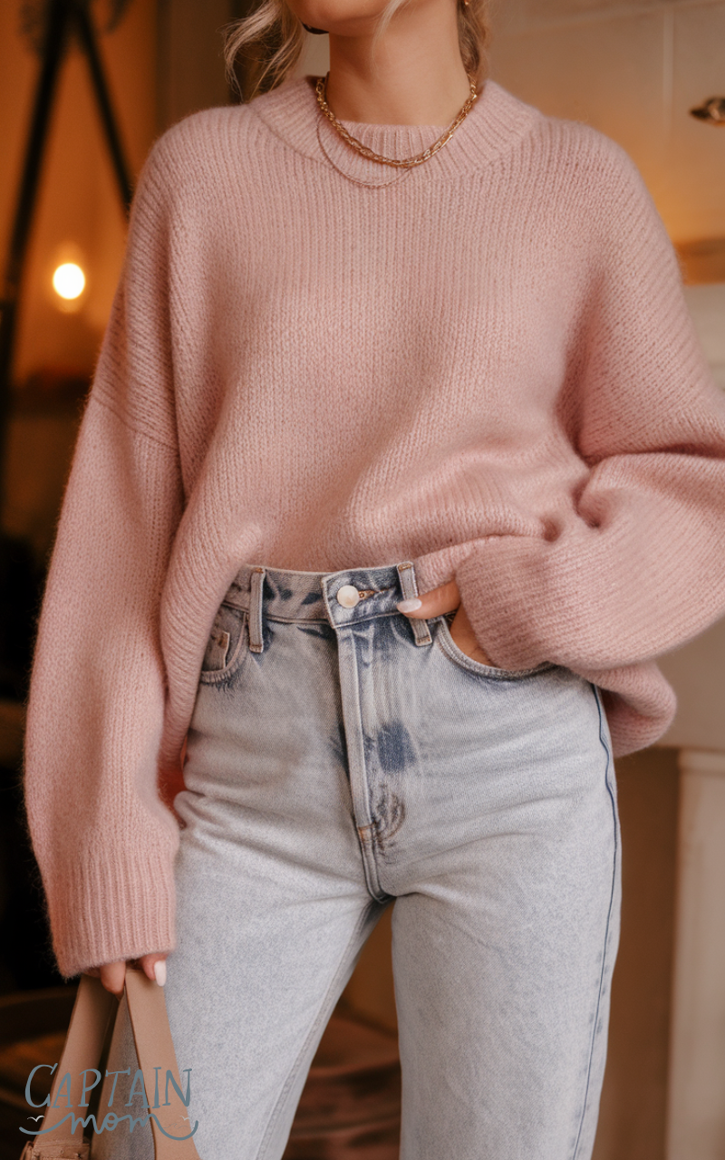 Nothing says cozy style using soft girl winter outfits like an oversized knit sweater. Soft pastels or neutral tones add a gentle touch, and pairing them with skinny jeans or leggings balances the volume. Busy mornings are easier too, since oversized sweaters are forgiving and require minimal styling. This outfit is practical, warm, and perfectly aligns with the soft girl aesthetic while keeping your winter look effortlessly cute.