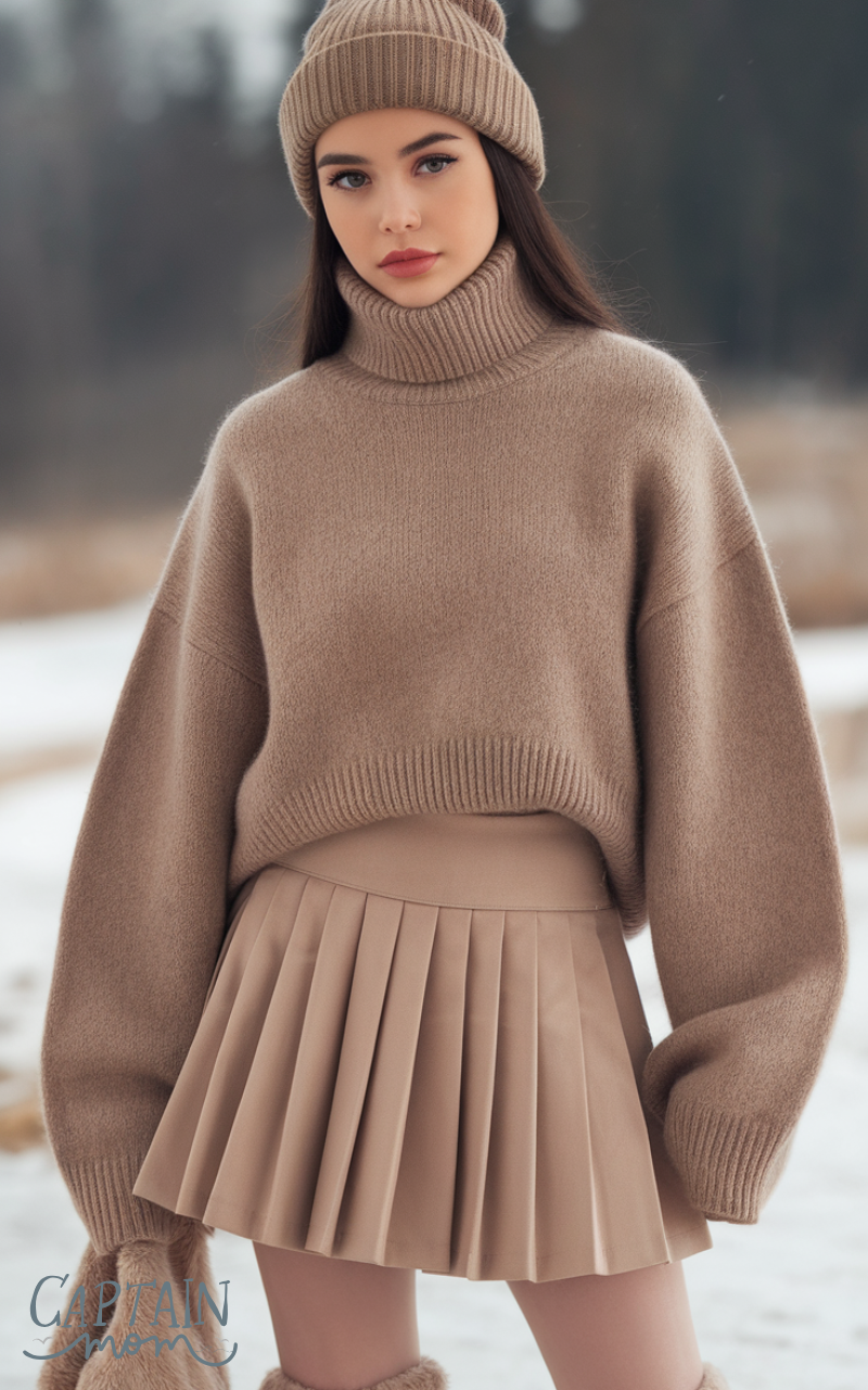 A pleated mini skirt combined with opaque tights is a playful way to show cozy style using soft girl winter outfits. Soft colors like cream, pink, or lavender enhance the soft girl vibe. Pair with an oversized sweater or cardigan for warmth and comfort. This look keeps you stylish while staying cozy and is perfect for layering without feeling restricted.