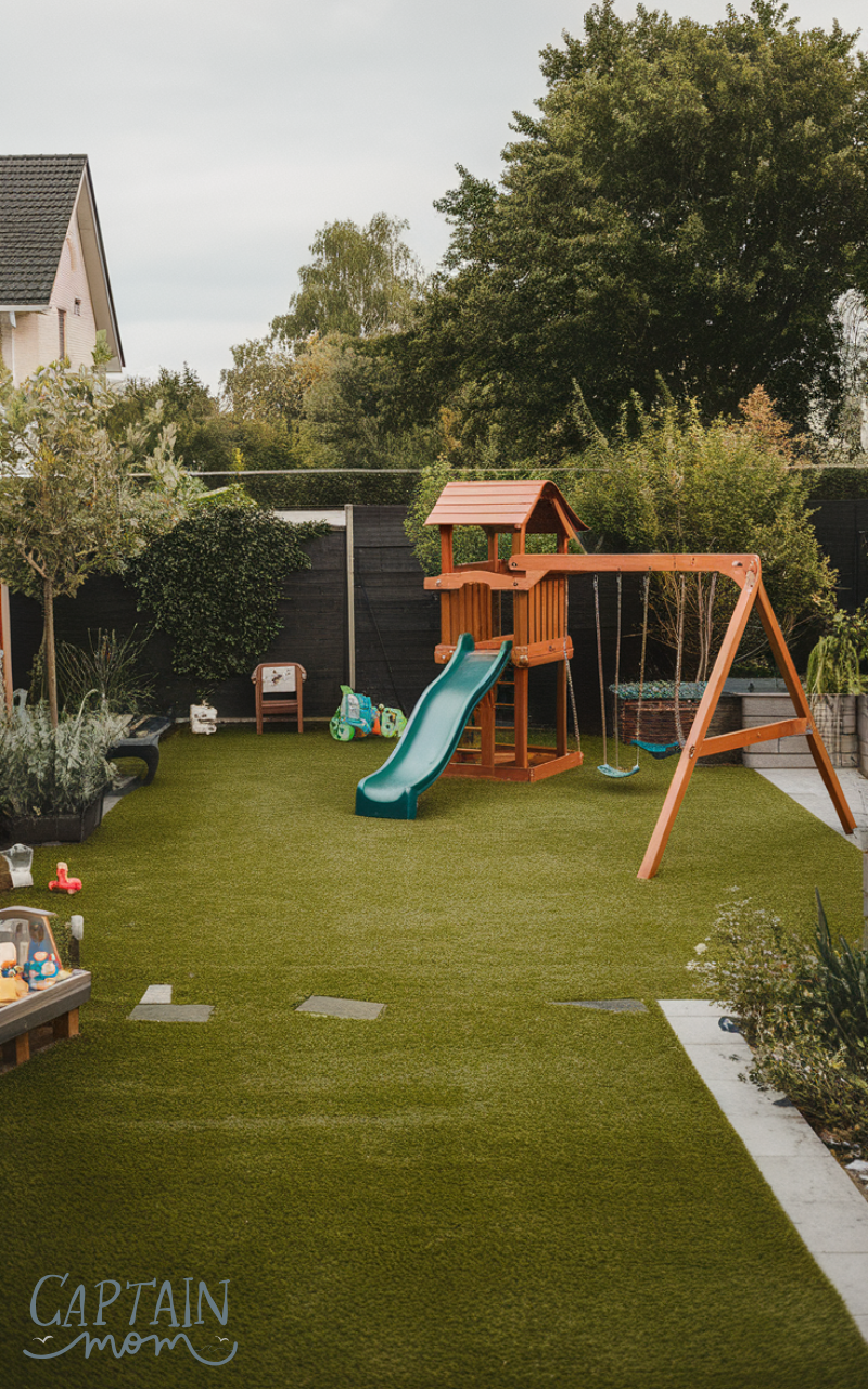 Artificial grass is a practical solution in garden ideas for busy moms with kids. It requires no mowing, watering, or fertilizing and stays green year-round. Busy parents enjoy a clean, safe play area that looks great without constant work. This option is especially helpful for families with limited time for lawn care.