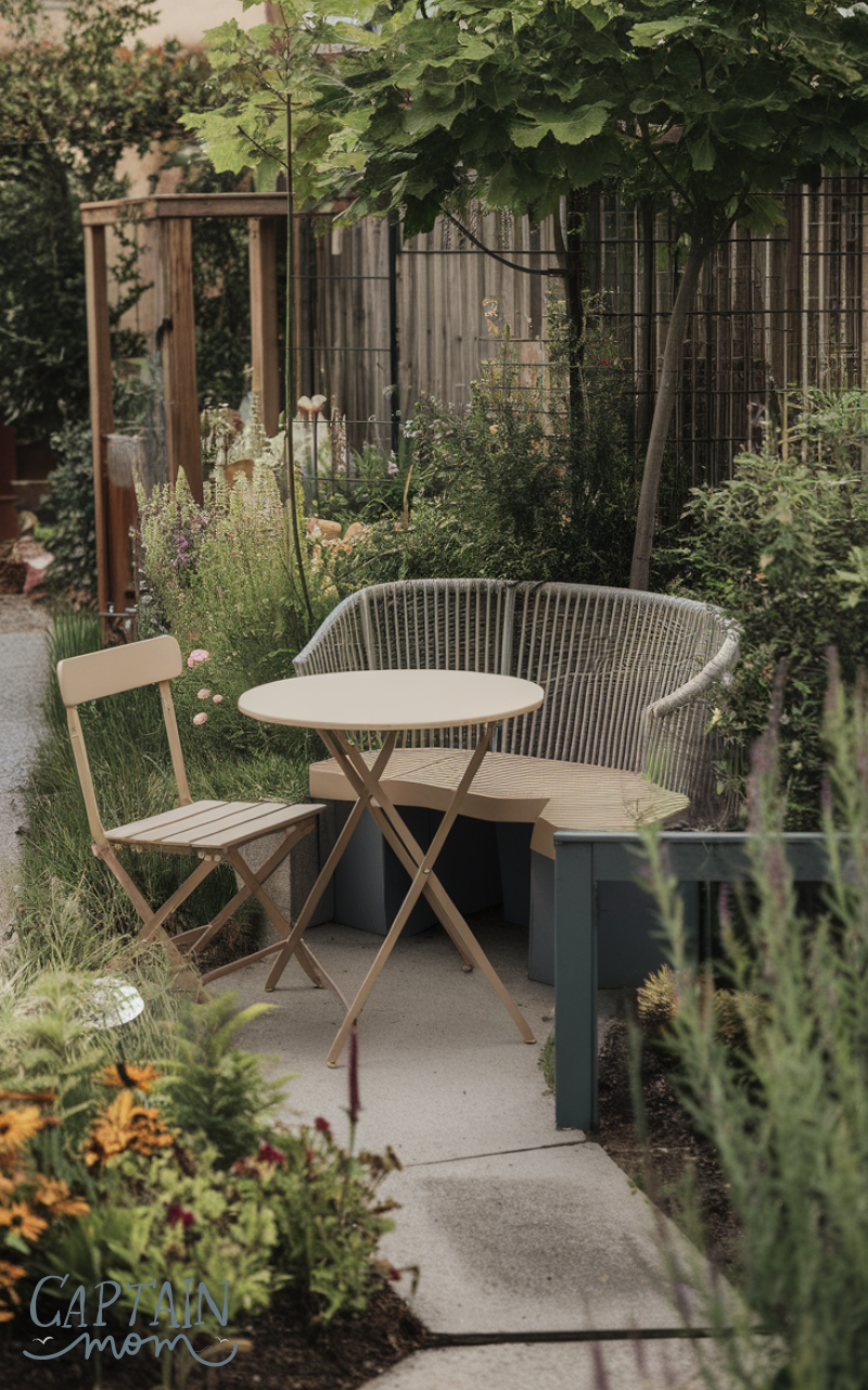 Creating a small seating area is one of the most rewarding garden ideas for busy moms. A simple bench or compact outdoor furniture allows busy parents to relax without maintaining large landscapes. It encourages quick outdoor breaks and family moments without adding extra work.