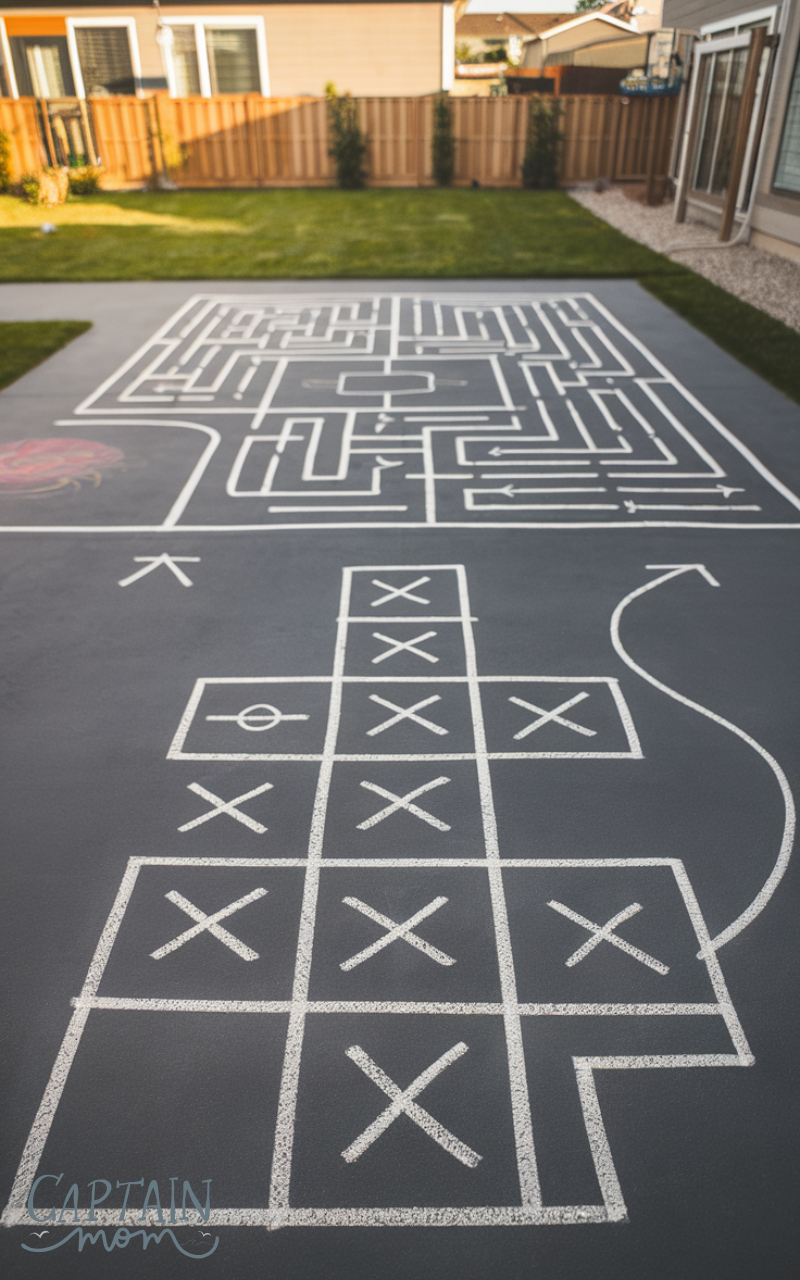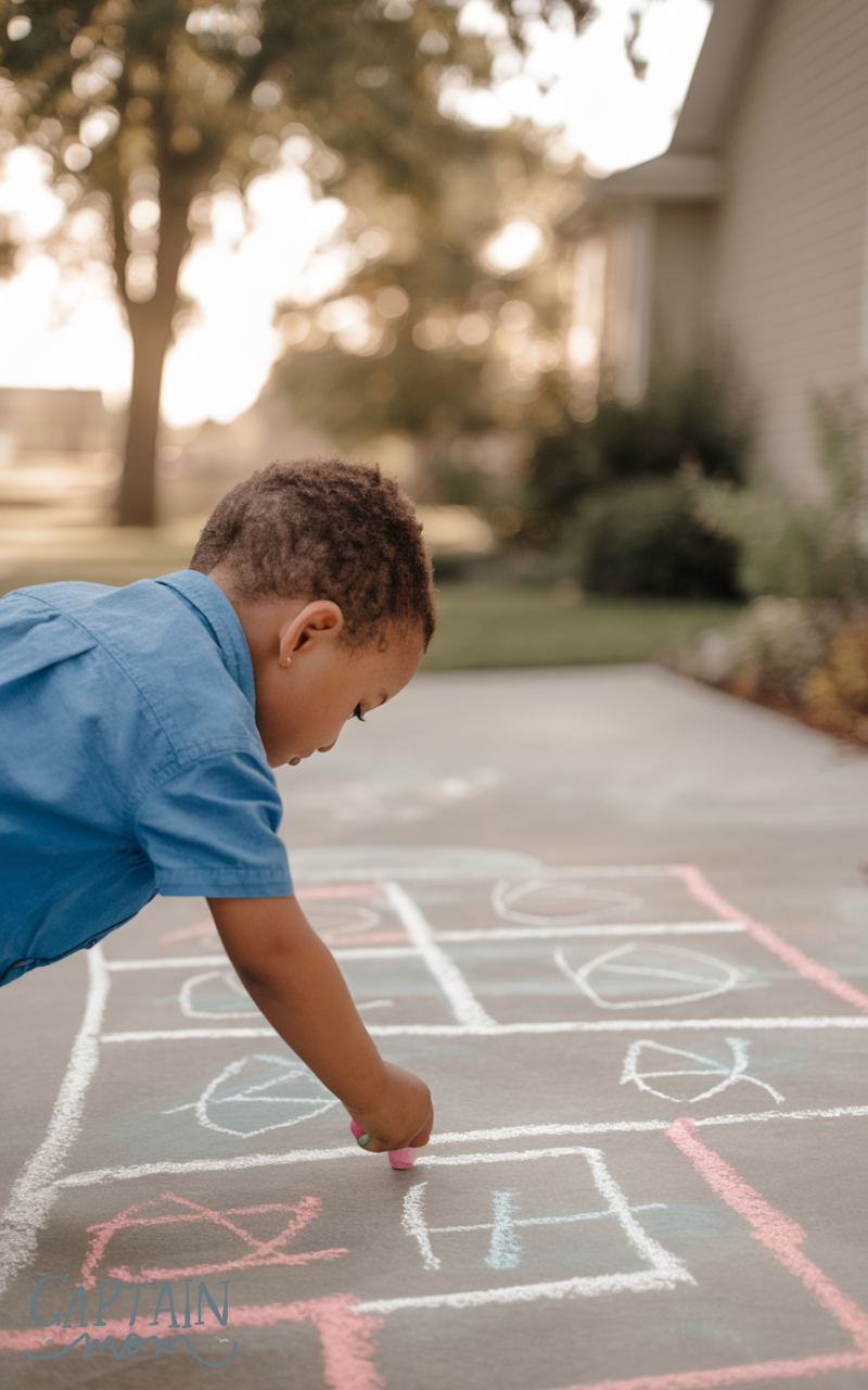 Draw classic games like hopscotch, four square, and mazes with chalk — another awesome outdoor fun backyard activity for kids at home. Kids jump, hop, and follow paths in playful challenges that promote fitness and balance. Games like these are timeless, joyful, and require nothing more than chalk and imagination.