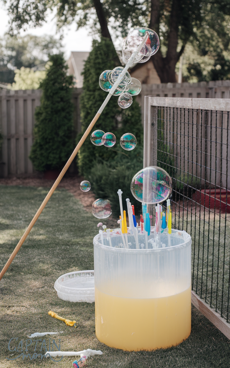Set up a bubble station with different sizes of bubble wands and soap solution — one of the easiest yet most magical outdoor fun backyard activities for kids at home. Kids love chasing and popping bubbles, and you can even make giant bubbles with DIY wands. It’s light, cheerful play time that keeps them laughing and moving. Bubble play encourages coordination and provides endless fun with minimal equipment.