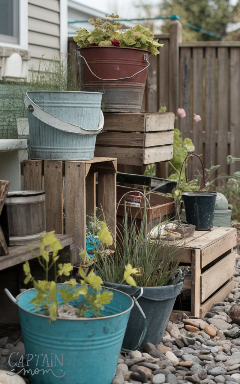 Old buckets, baskets, or wooden crates are perfect for small yards upgraded with small backyard ideas on a budget. Repurposing containers as planters saves money and adds character. Paint them for a fresh look or leave them natural for a rustic style. This idea allows flexibility since containers can be moved easily, helping you change layouts whenever you want while keeping costs low and creativity high.