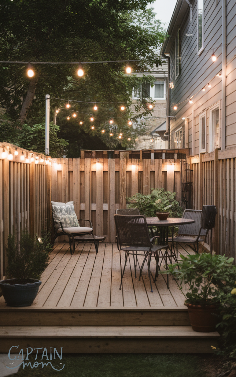 Lighting plays a big role in small yards upgraded with small backyard ideas on a budget. String lights are affordable and easy to install on fences, walls, or poles. They create a warm and cozy atmosphere that makes small yards feel magical at night. Solar-powered options help save energy and reduce costs. This idea improves both function and style, allowing you to enjoy your backyard after sunset without major expenses.