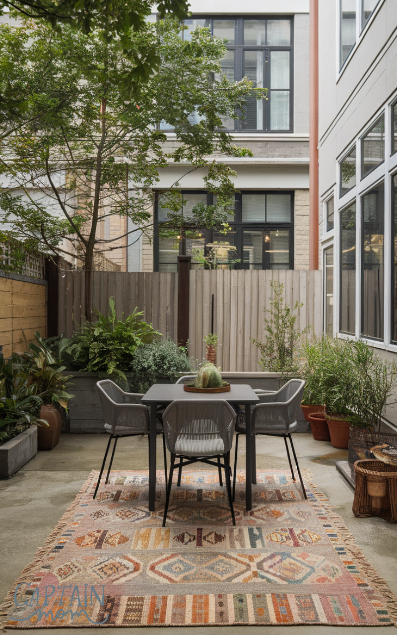 Outdoor rugs instantly upgrade small yards upgraded with small backyard ideas on a budget by defining seating or dining areas. They add color, texture, and warmth to concrete or dirt floors. Budget-friendly outdoor rugs are durable and easy to clean, making them ideal for small spaces. This simple addition helps the backyard feel like an outdoor room, creating comfort and style without expensive renovations or permanent changes.