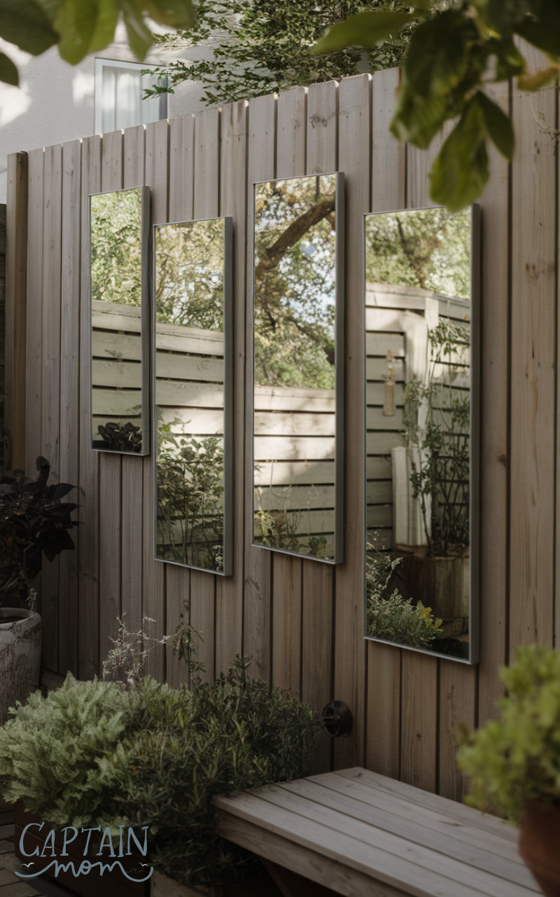Mirrors are a clever trick for small yards upgraded with small backyard ideas on a budget. Placing weather-resistant mirrors on walls or fences reflects light and greenery, making the space feel larger. This budget-friendly idea adds depth and visual interest without taking up space, creating the illusion of a bigger backyard.