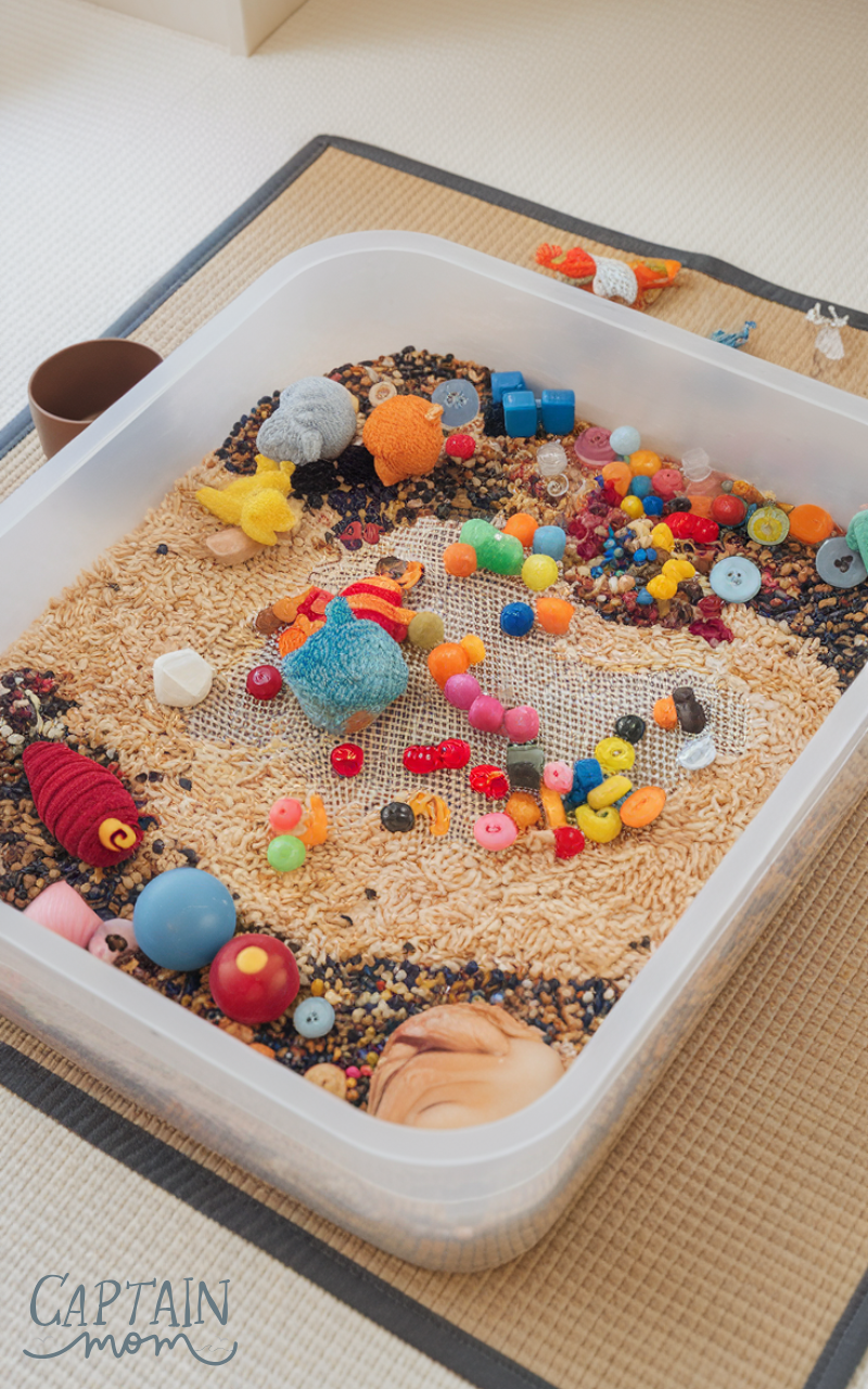 Sensory bins are powerful additions to Toddler Independent Play Setups at Home because they stimulate curiosity through touch and discovery. Fill a shallow container with rice, pasta, or safe sensory materials and add scoops or cups. Keep materials simple and rotate themes weekly to renew interest. Sensory play supports fine motor skills and concentration while offering calming benefits. Placing a mat underneath makes cleanup manageable and allows toddlers to explore freely without constant correction. This setup works especially well during quiet afternoons when children need focused, soothing play.