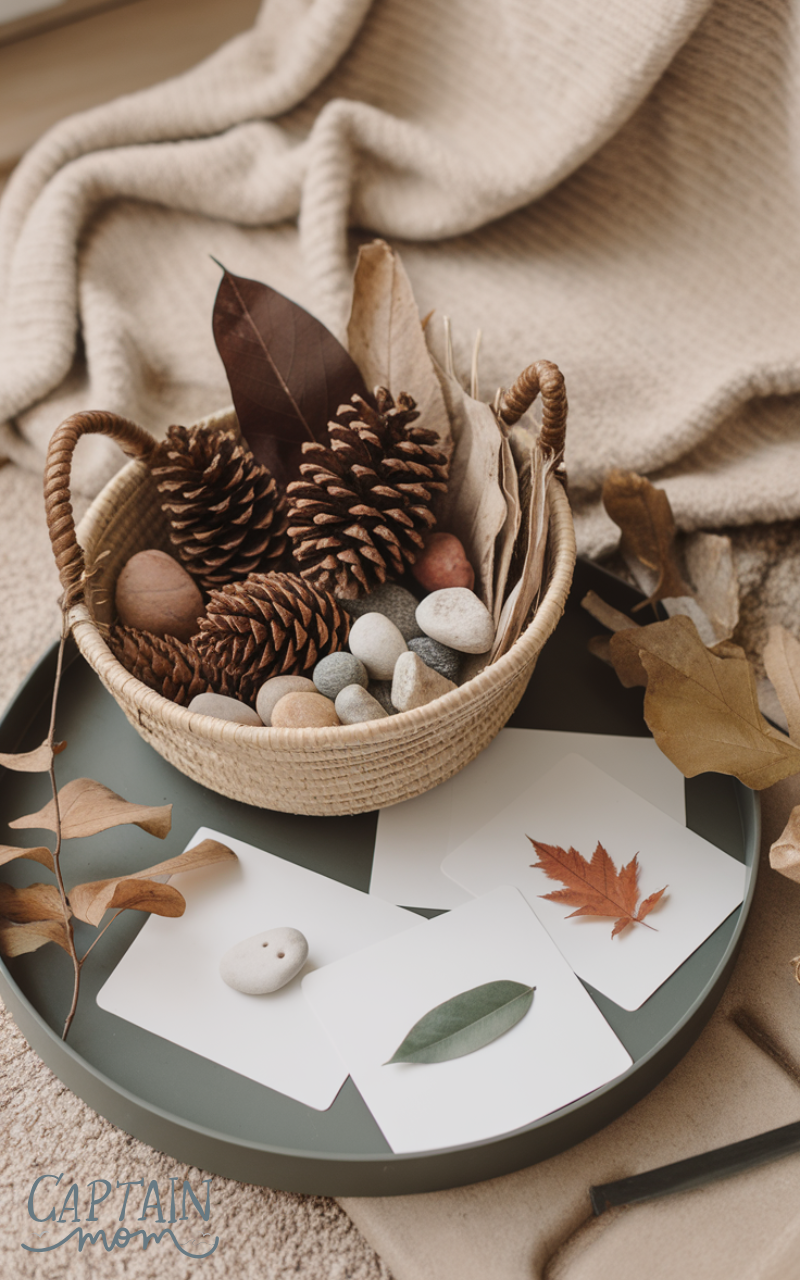 Nature baskets bring calm discovery into Toddler Independent Play Setups at Home. Fill a tray with pinecones, smooth stones, leaves, or safe natural objects collected during walks. Toddlers enjoy touching and sorting these items while learning about textures and the environment. Natural materials often hold attention longer because they feel real and unique. Pairing objects with simple picture cards can spark curiosity without structured teaching. This setup connects children with nature even when playing indoors.