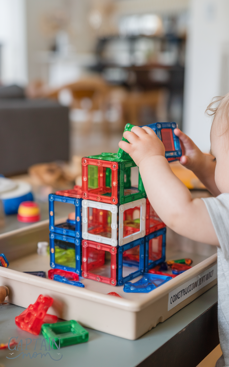 A construction tray with magnetic tiles or chunky connectors enriches Toddler Independent Play Setups at Home by combining creativity with engineering basics. Present pieces on a defined tray to signal where play happens and where cleanup belongs. Toddlers experiment with balance and shapes while strengthening hand coordination. Because outcomes are open-ended, children stay engaged longer. Independent building also encourages trial and error, an essential learning process that boosts resilience and confidence during play.